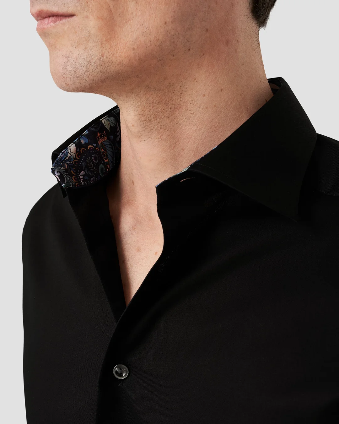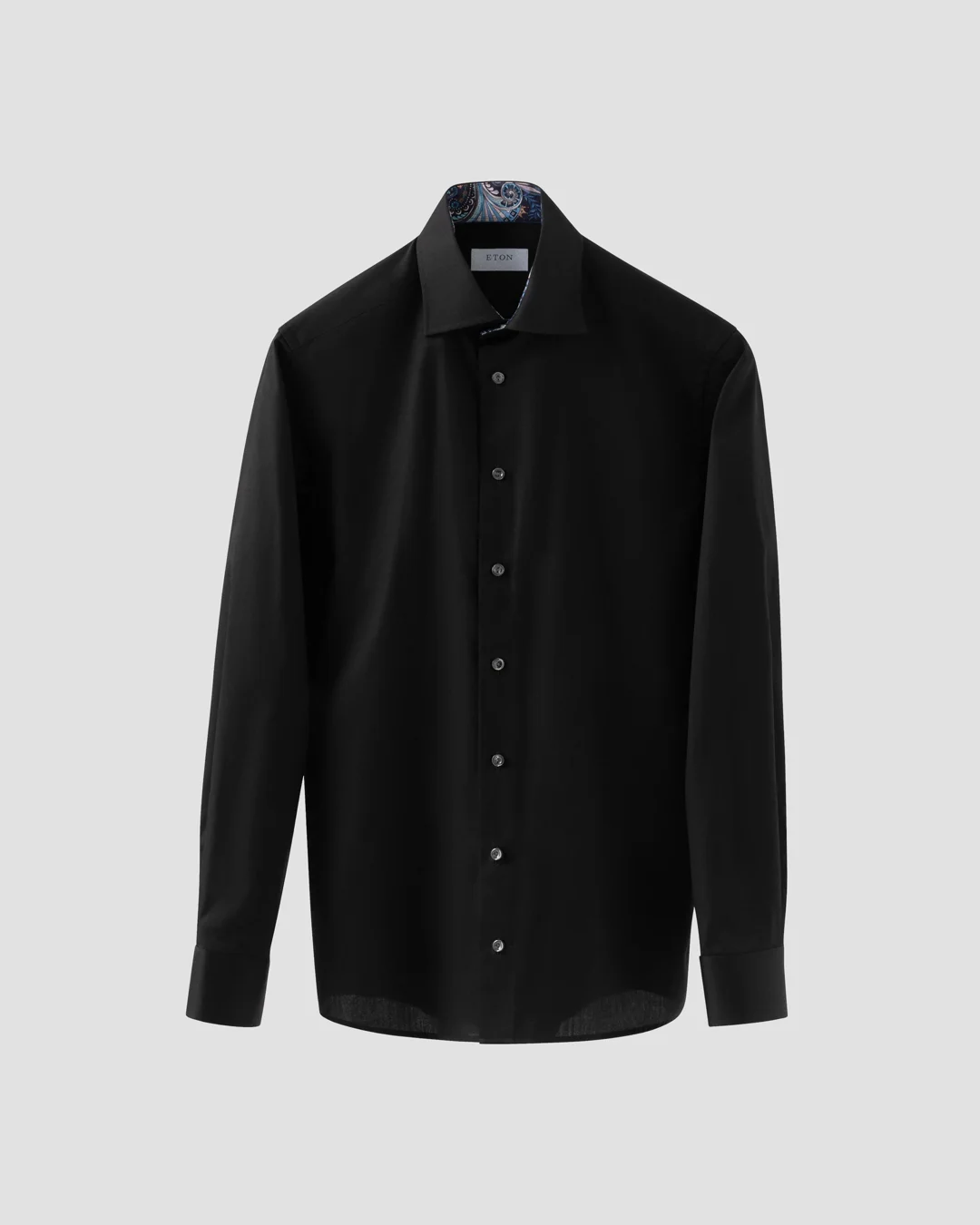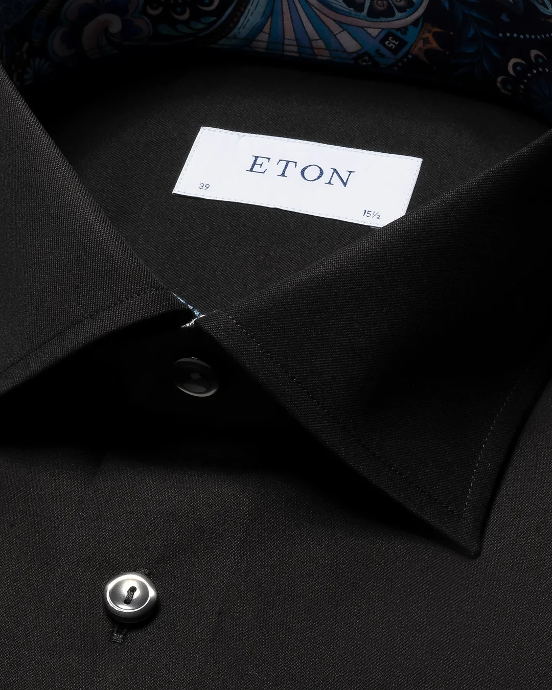 Take your outfit to the next level with Eton's Signature Twill Slim-Fit Shirt featuring a playful micro geometric print inside the collar and cuffs, light blue buttons, and a contemporary cut away collar. Look effortlessly stylish with the added benefits of soft touch, luster, and wrinkle-free fabric.