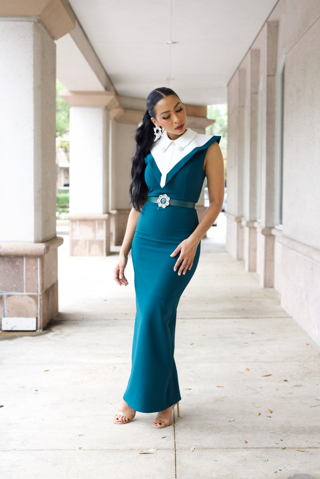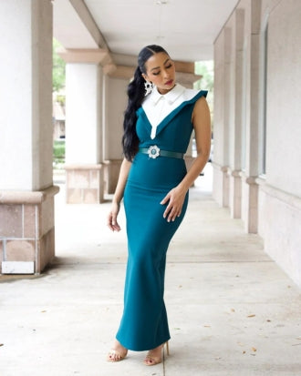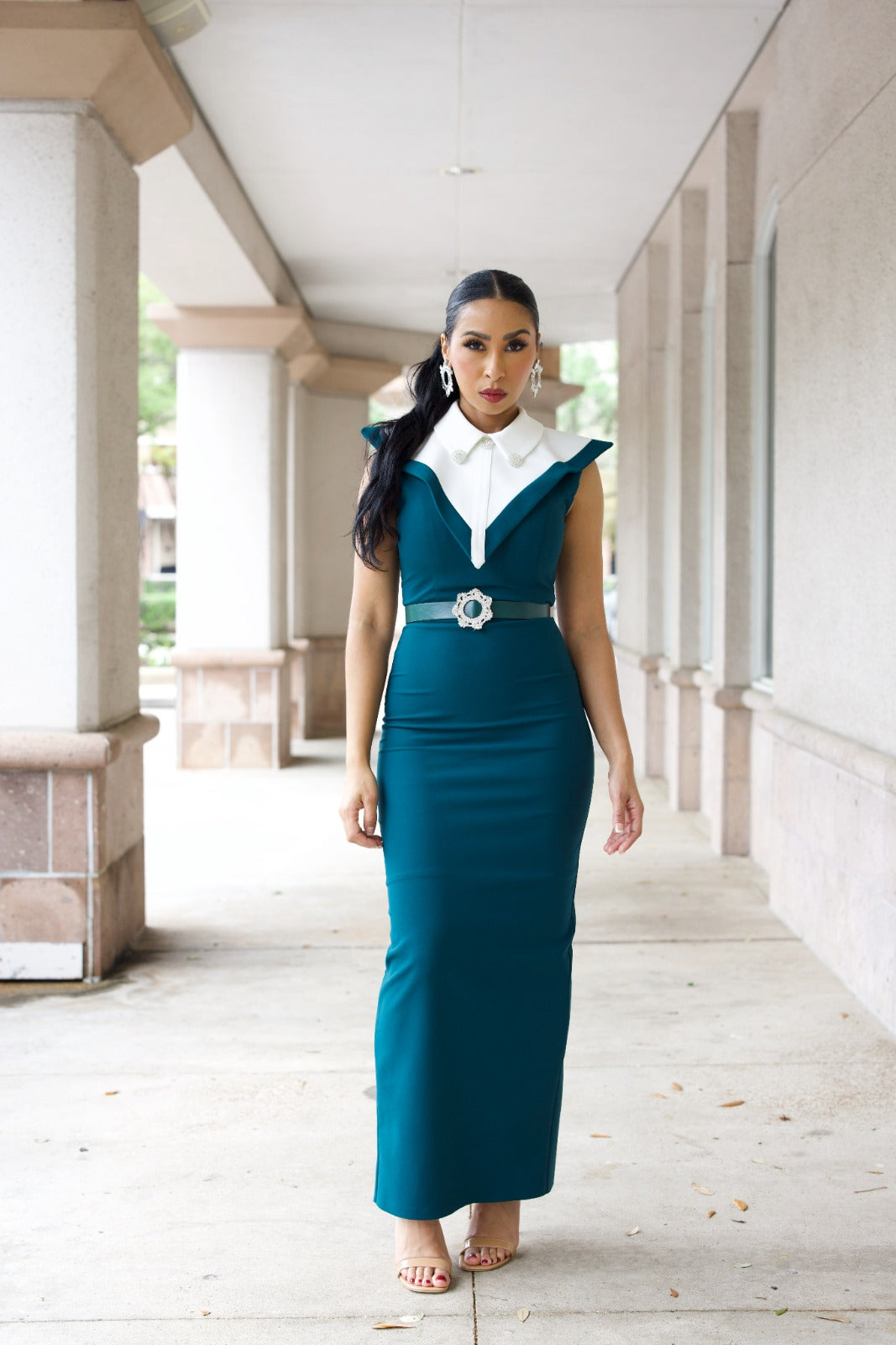 The Eva dress offers a flattering midi length, fitted silhouettes, and a detail rhinestone belt for a touch of glamour. With a high neck and exaggerated collar, as well as pearled buttons and a unique V cape detail, this dress is sure to make a statement. Complete with a back zipper for easy dressing.