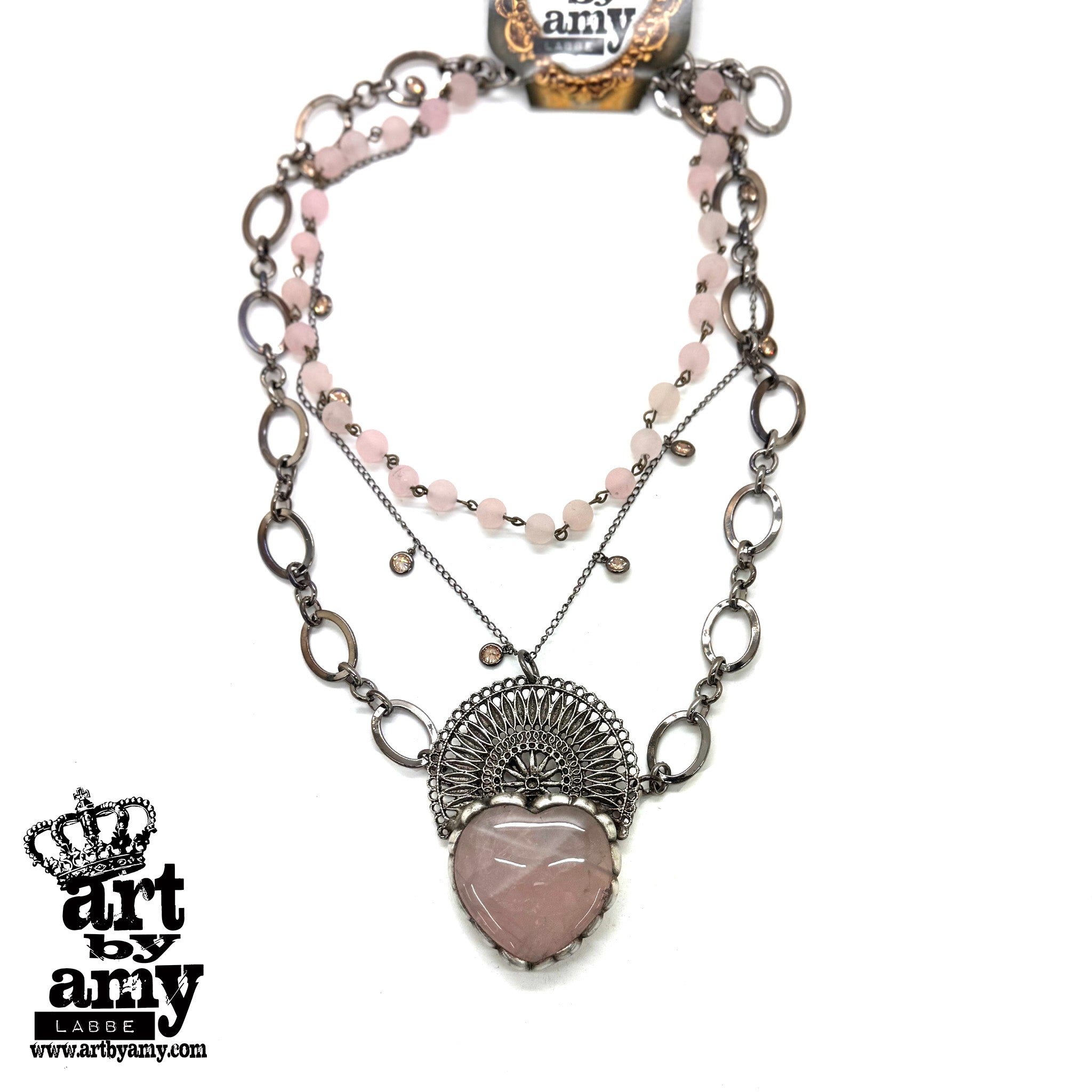 The Evangeline Pink Rose Necklace is a gorgeous & unique necklace that is adjustable up to approximately 20" with gunmetal oval chain, gunmetal small chain with champagne bling, pink rose quartz wired bead chain, and a 3" headdress pendant with a breathtaking rose quartz stone heart. This beautiful piece is sure to attract the attention you deserve!