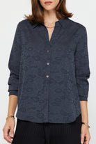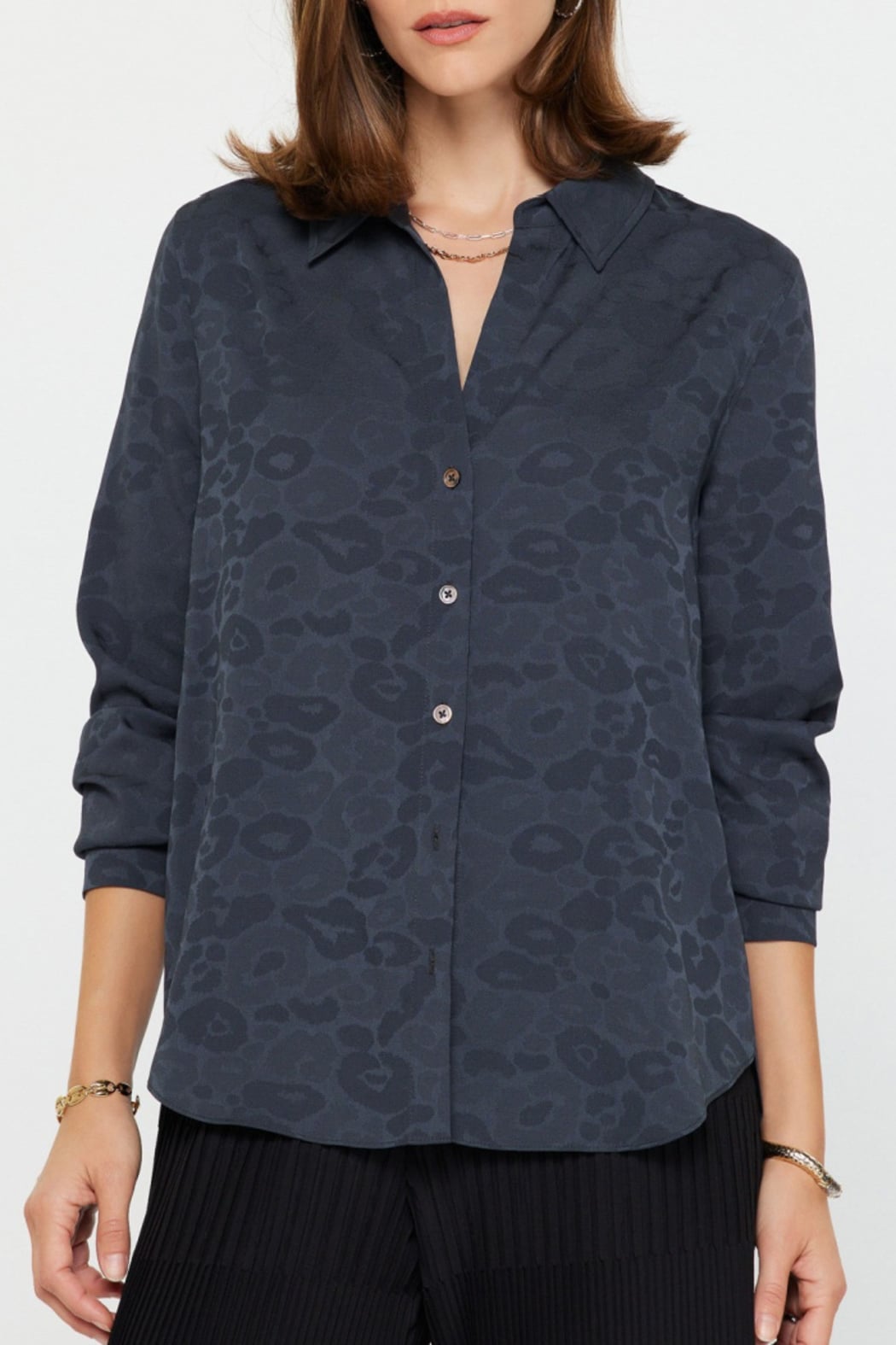 A relaxed button-down with a subtle jacquard leopard pattern and a classic shirt collar, this piece updates workwear with a modern print. The Current Air Evelyn Blouse features long sleeves and a slightly curved hem for easy layering over trousers or skirts. Lightweight woven fabric gives it a polished drape that moves comfortably from desk to dinner.