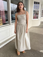 Get ready to turn heads with the Evelyn Midi Dress! This playful piece features a striped woven fabric, square neckline, and gathered top for a unique and stylish look. Plus, the spaghetti self tie straps add a touch of fun and individuality. Perfect for any occasion, this dress will make you the life of the party!