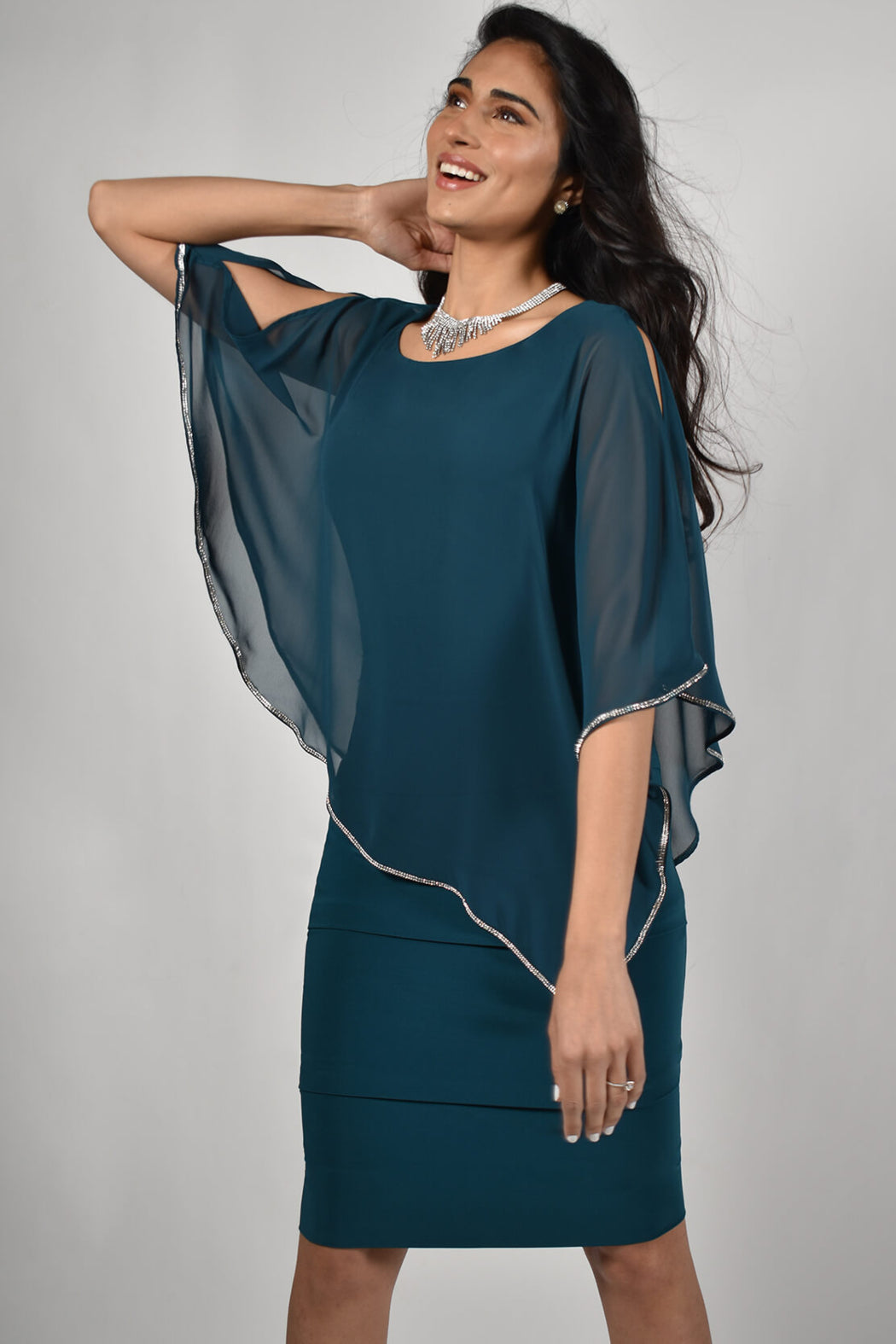 Evergreen dress with tucking treatment at the skirt with a chiffon overlay trimmed with rhinestones.