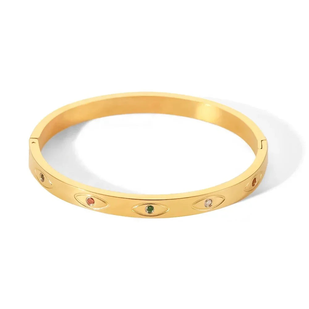 Protect yourself from negativity with this colorful evil eye bangle. Fashionable and functional, this bangle will ward off bad vibes and add a pop of color to your outfit. Don't leave the house without your lucky eye!