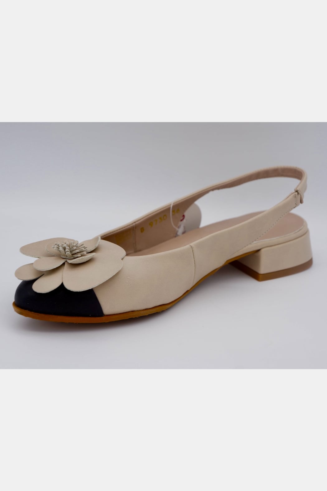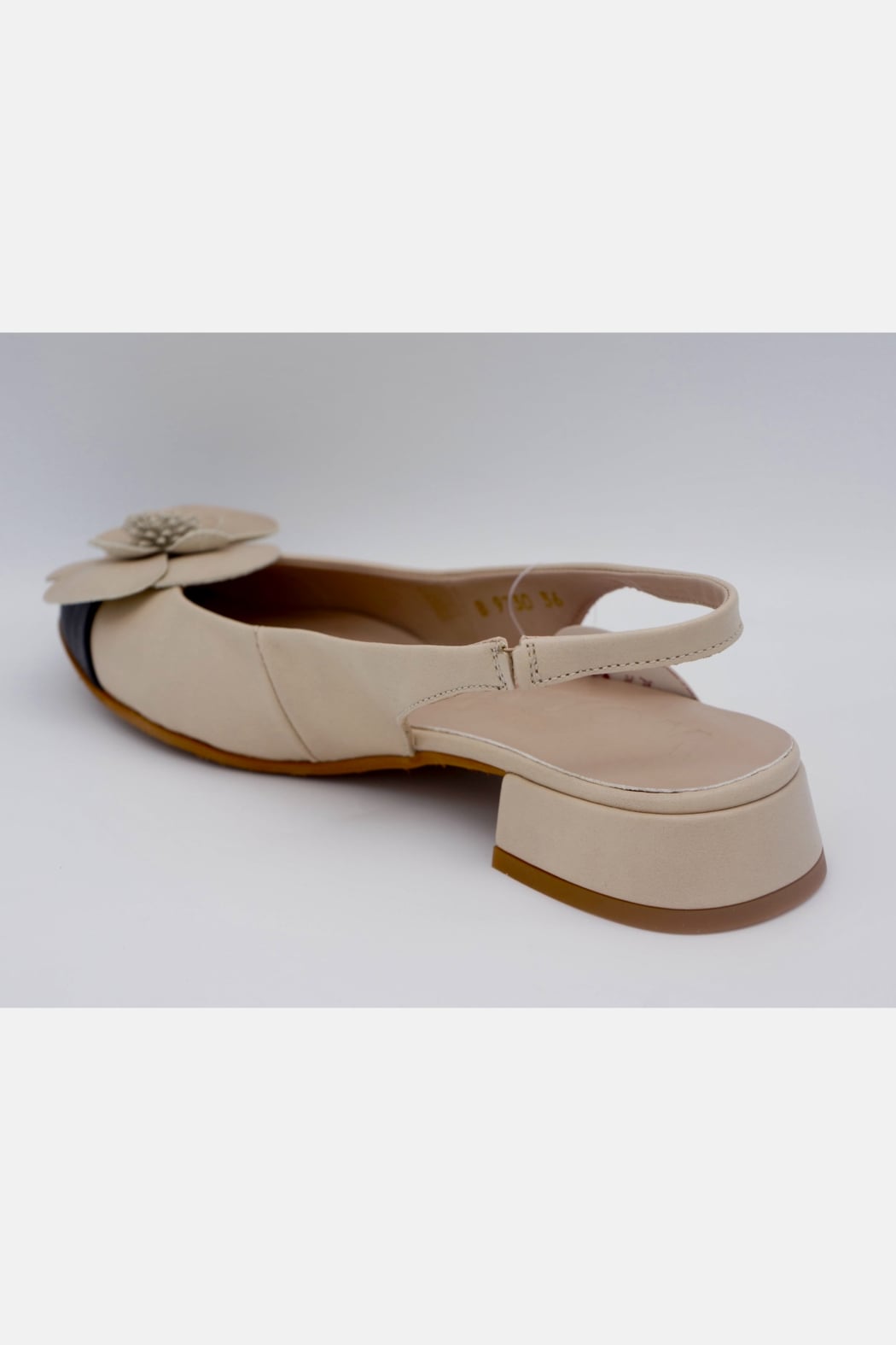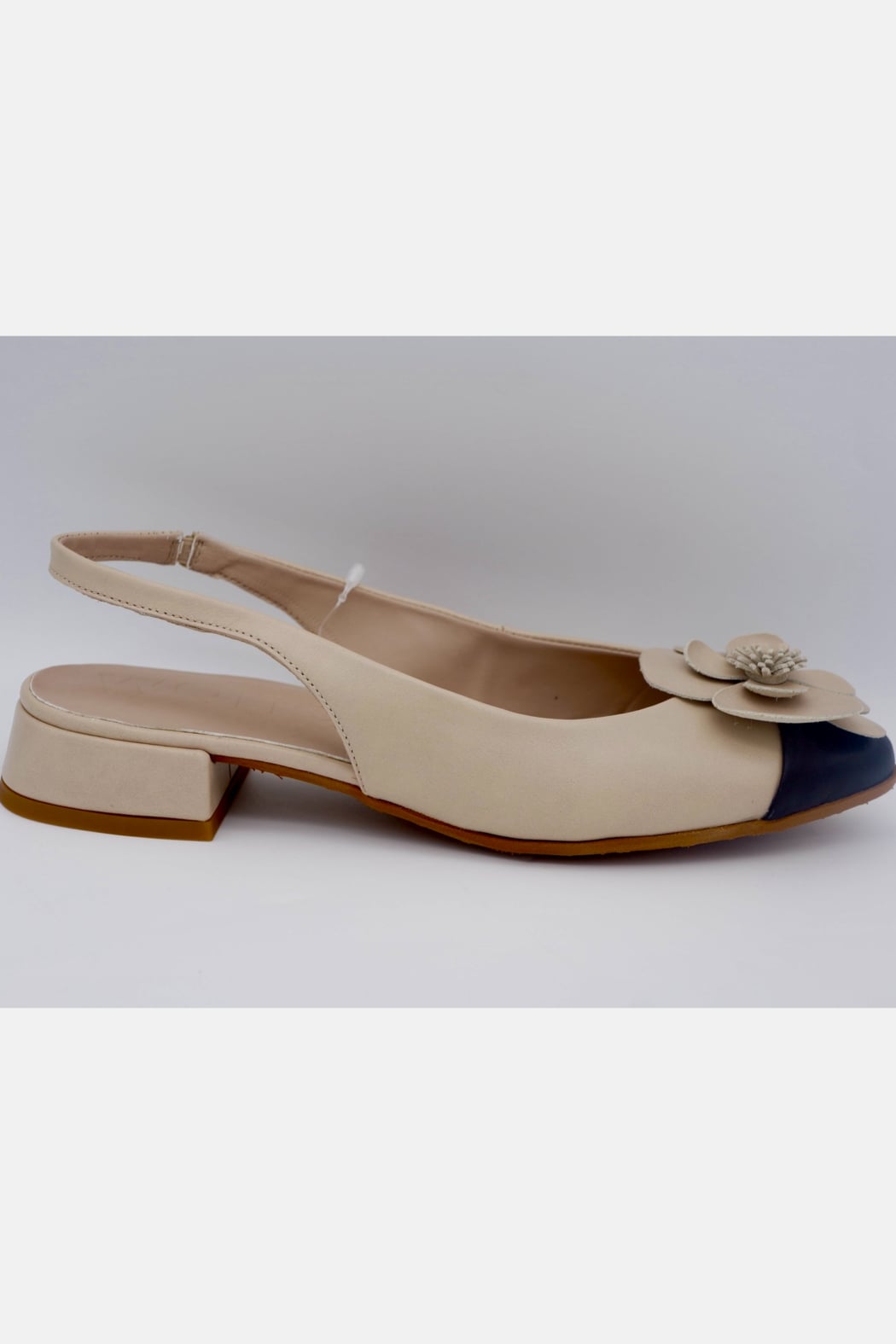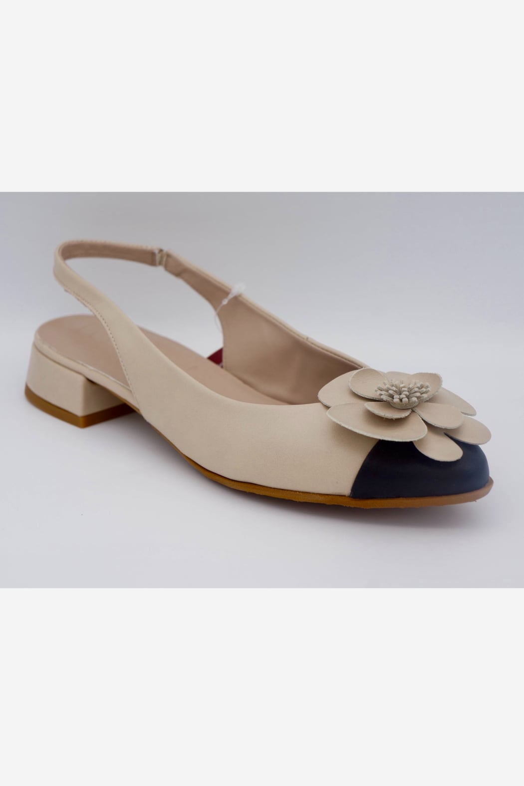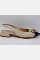 Elegant, feminine, and designed for all-day comfort. This beautiful slingback is crafted from soft genuine leather and features a delicate flower detail with a stylish contrast toe. The low block heel adds just the right amount of lift while keeping the shoe comfortable and easy to wear.
