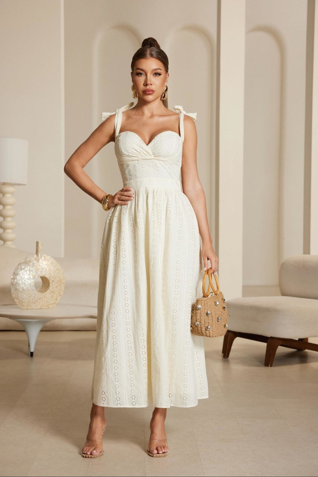 Tie shoulder eyelet dress. Model is wearing a size Small