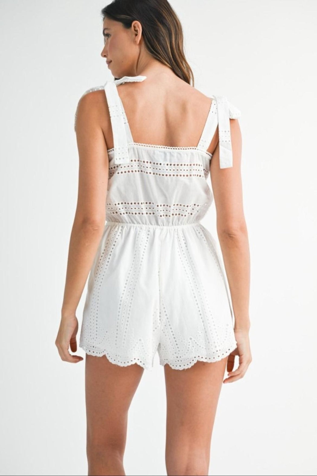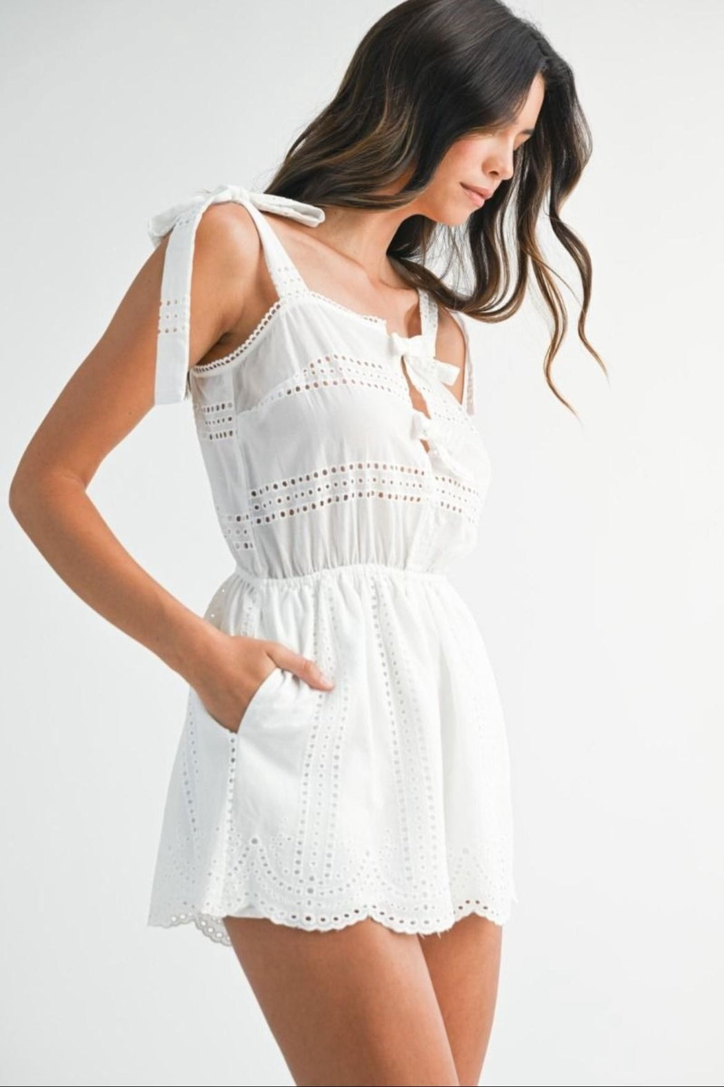Tie shoulder eyelet romper with front tie and pockets. Model is wearing a size Small