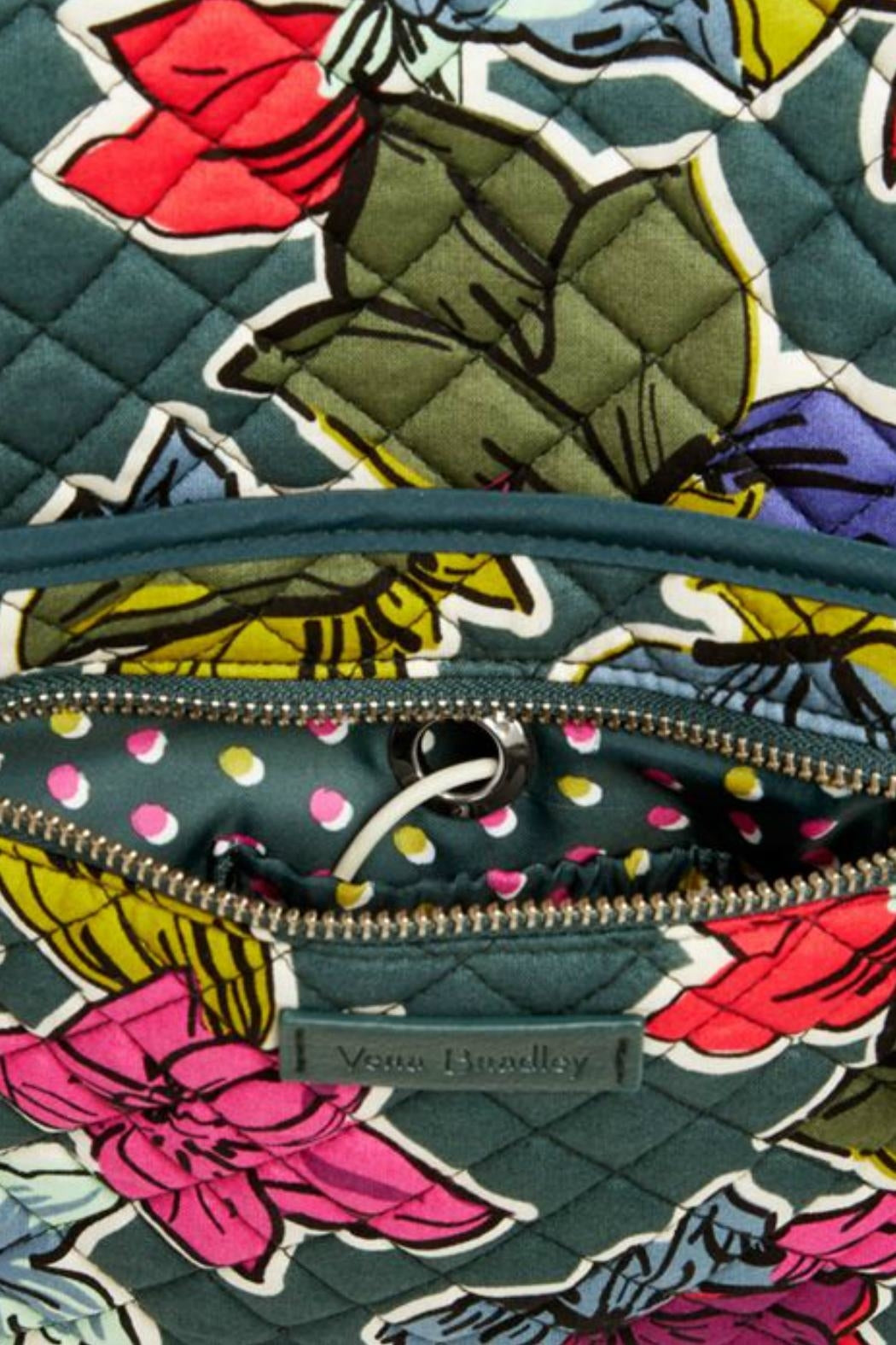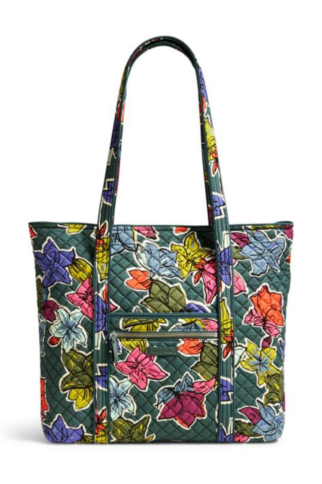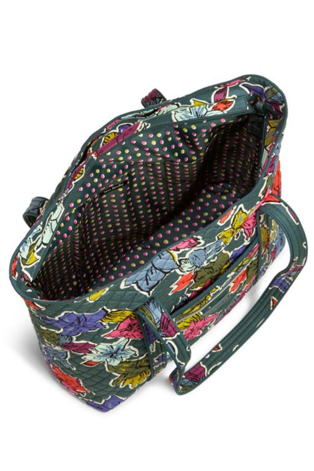 This is the Iconic Vera Tote in the Falling Leaves pattern. The Iconic style is a modern twist on Vera's classic silhouettes, refreshed with added functionality. This tote is large enough for the commute to the office with enough pockets to keep your protein bars separate from your pens. Works with Portable Battery Pack. This quilted cotton is colorful, lightweight, and packable. Exterior features a front slip pocket, a zip pocket containing a charger pocket and a hidden top pocket keep essentials safe and out of sight. Interior features six slip pockets. Printed polyester lining. Zip closure with silver tone hardware. Find other Falling Flower accessories on the "Mimi's Gift Gallery" boutique page. Dimensions 15" wide x 14 ½" high x 6" deep with 12" strap drop.
