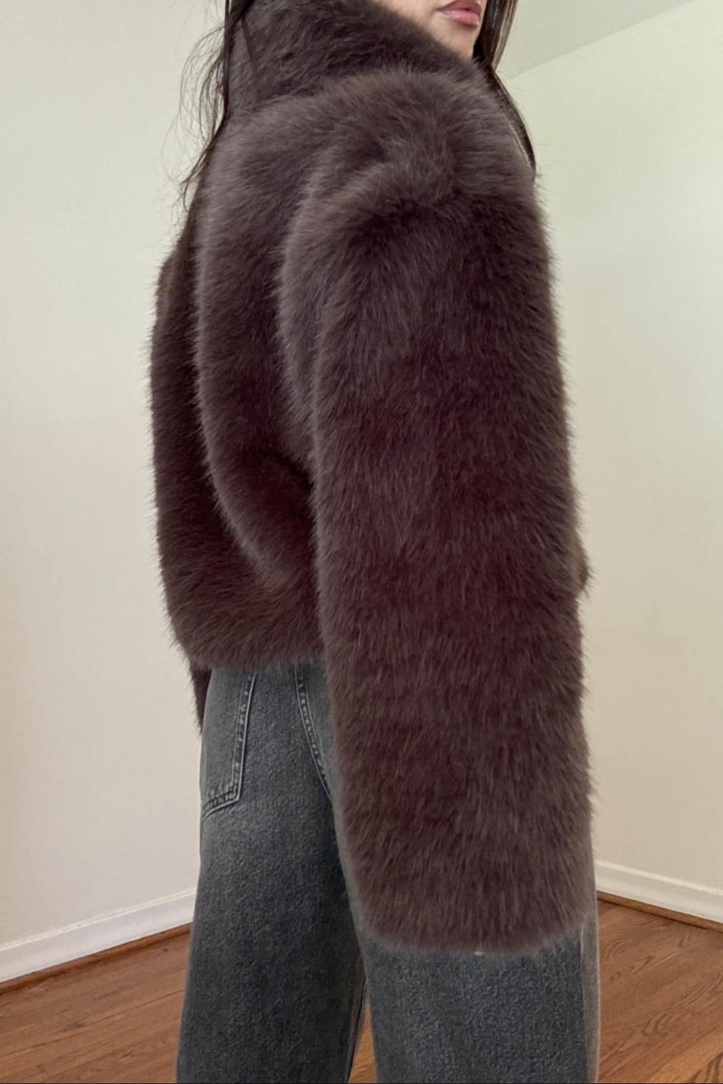Faux fur jacket. Model is wearing a size Small