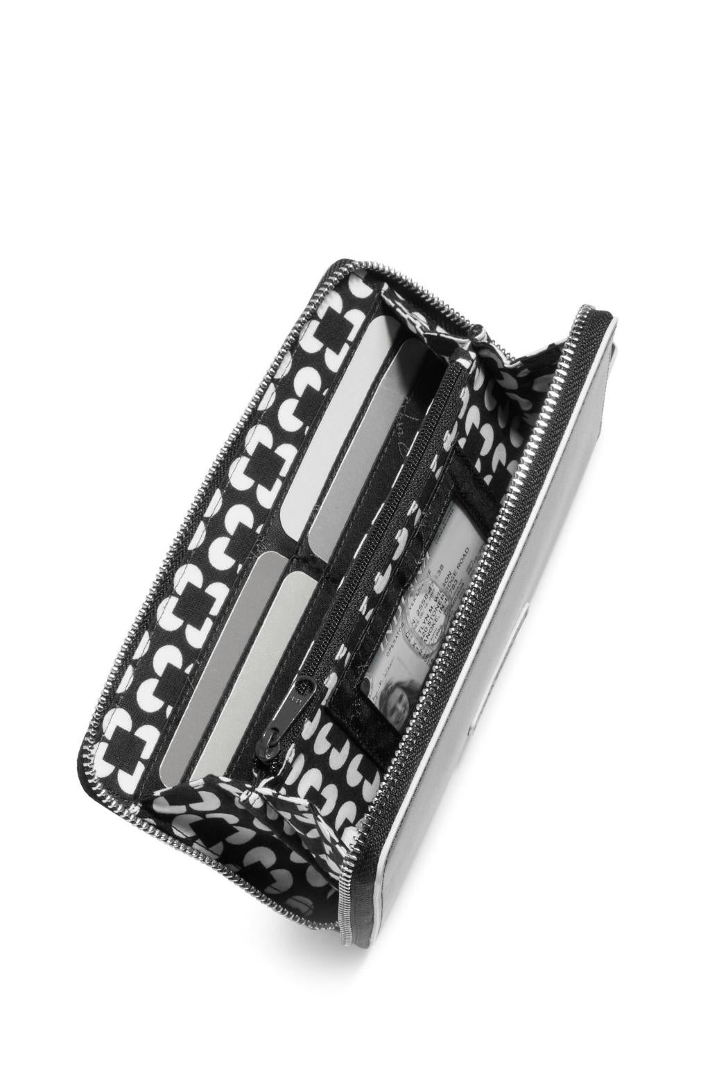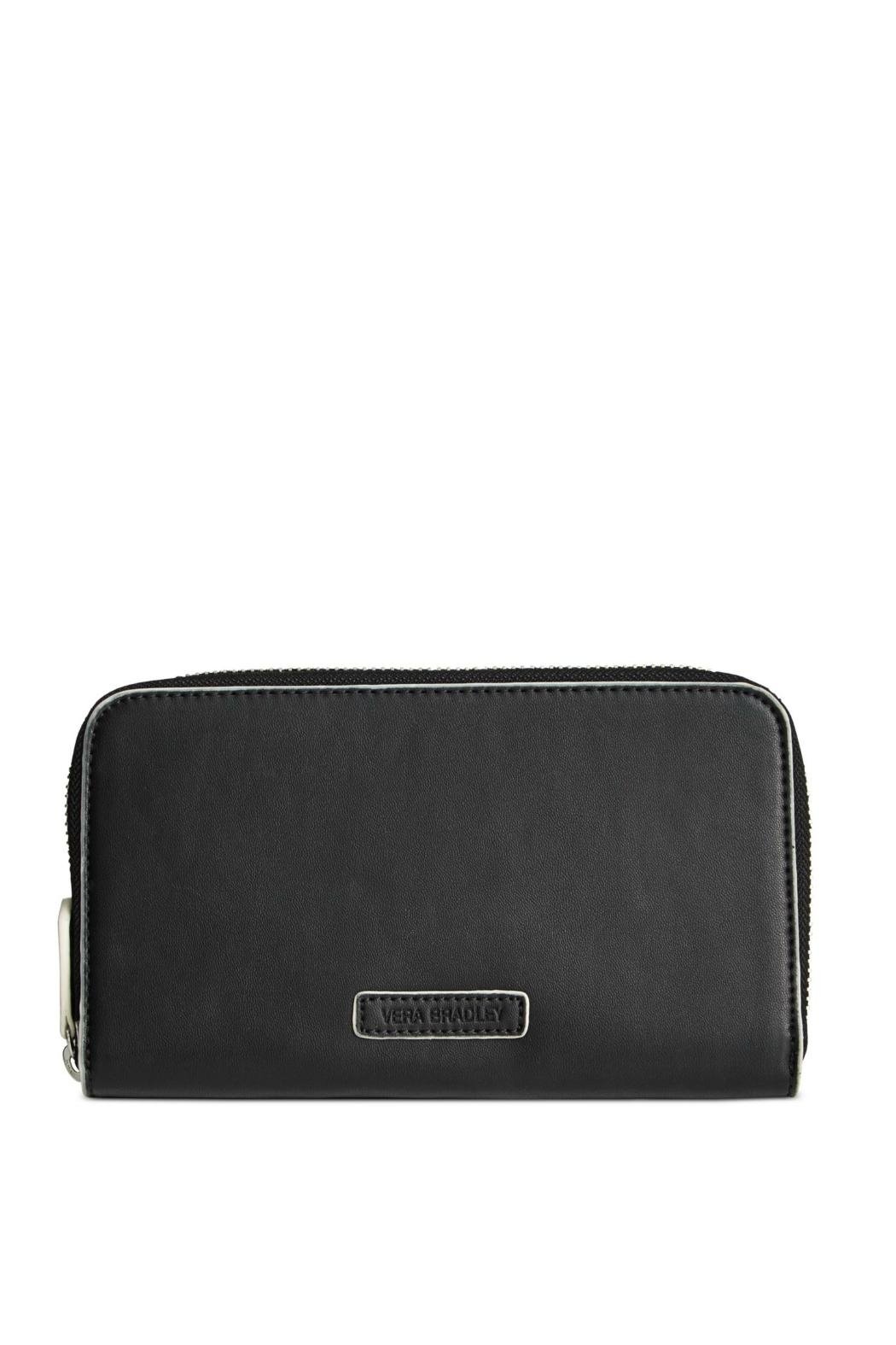 Here is the Vera Bradley Northbrook Vegan Leather Accordion Wallet in Black with White. Built to last, and so easy to clean - just wipe with a damp cloth! Signature imprint detail on front. Silver tone hardware. Inside are two large compartments divided by a zip coin pocket. In addition there are 12 card slips, 2 bill pockets, and an ID window. There is even room for your phone ( up to 7" long). Sturdy cotton black and white geometric print lining. Click on "Mimi's Gift Gallery" to find other matching black bags and accessories. Diminsions: 7.5" long x 4.5" high x 1" deep.
