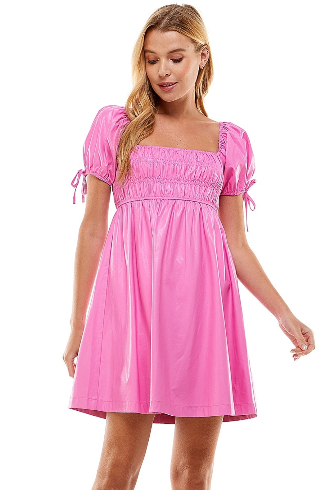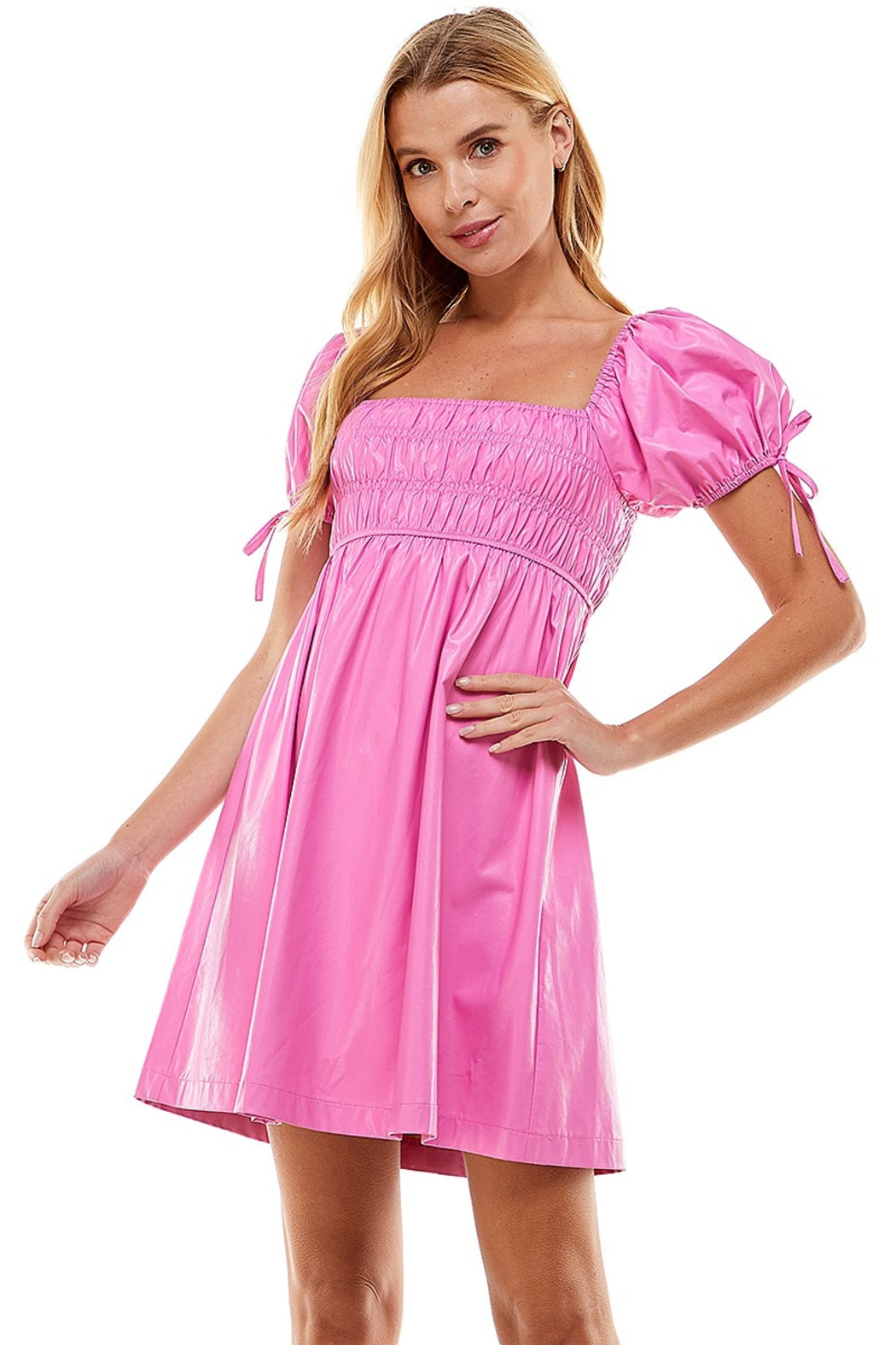 Pleather bubble sleeve dress, with smocked elastic top, high waistband, and A Line skirt. Ties on each sleeve.