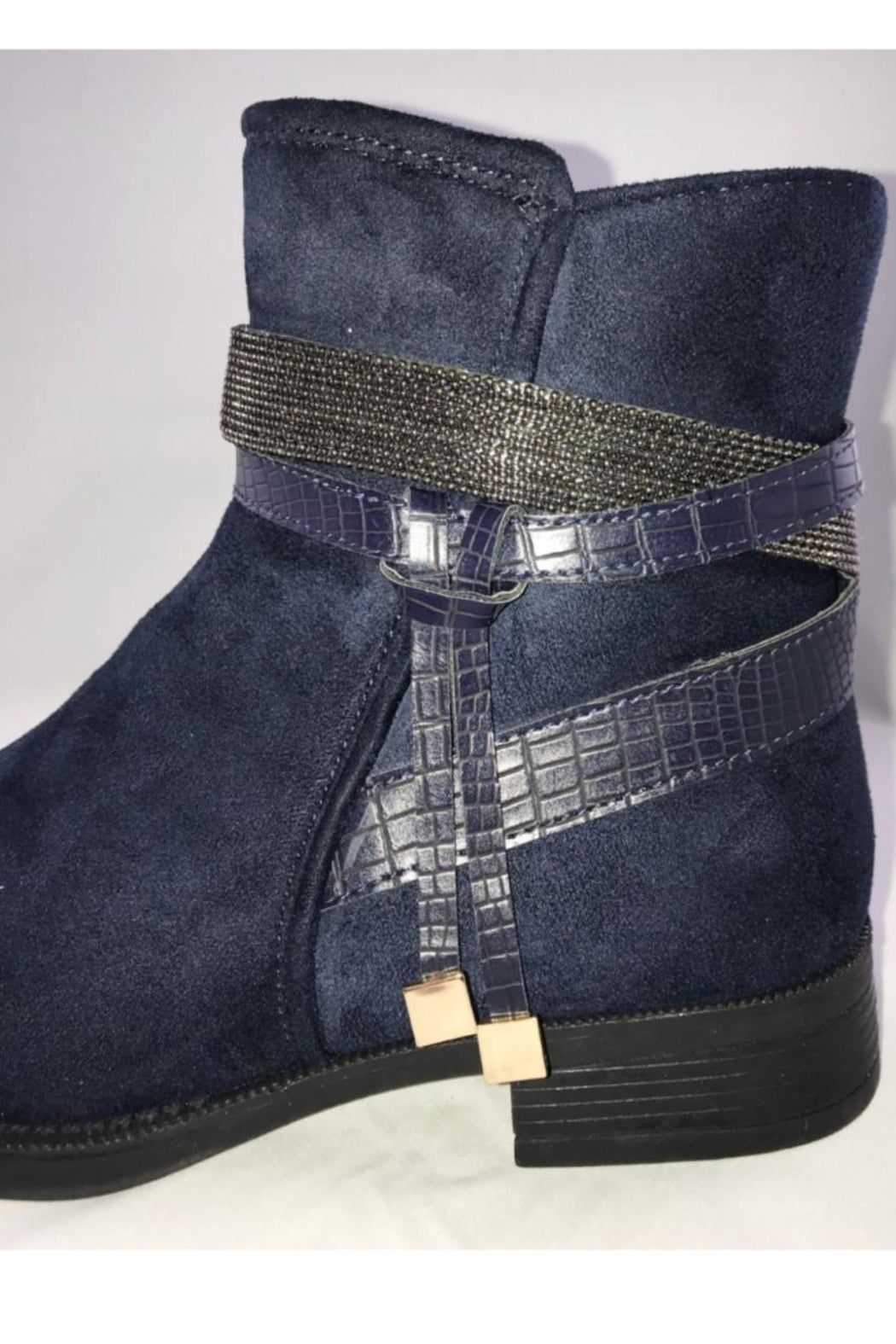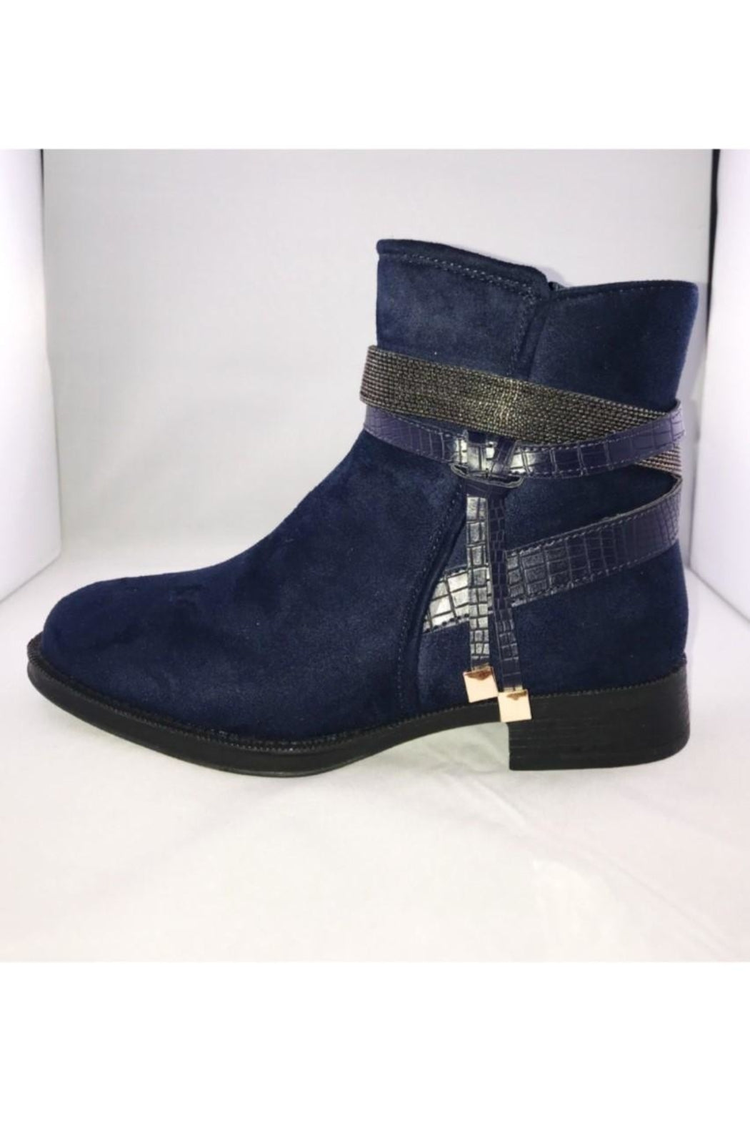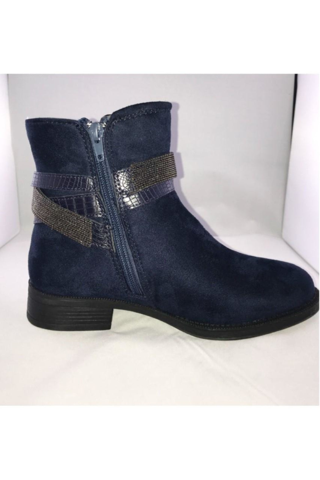 Faux suede booties in navy or black are an essential for your fall or winter wardrobe! Embellished detail around the ankle. They pair easily with jeans and look cute with a dress! Inside zip for ease of putting on or taking off. Small block heel.