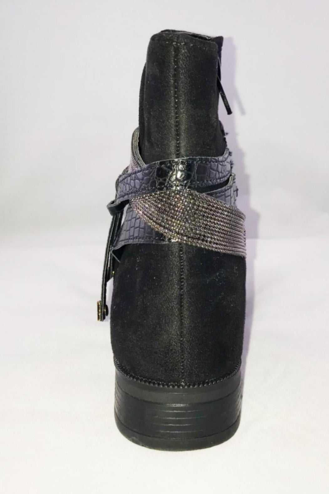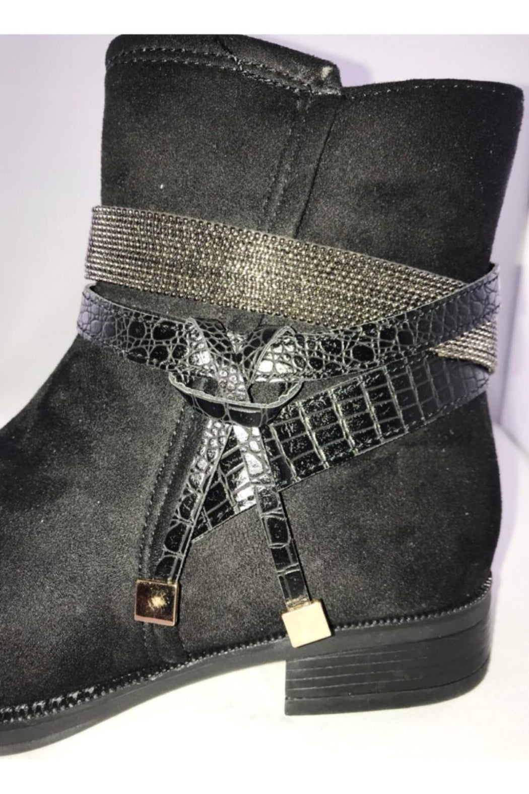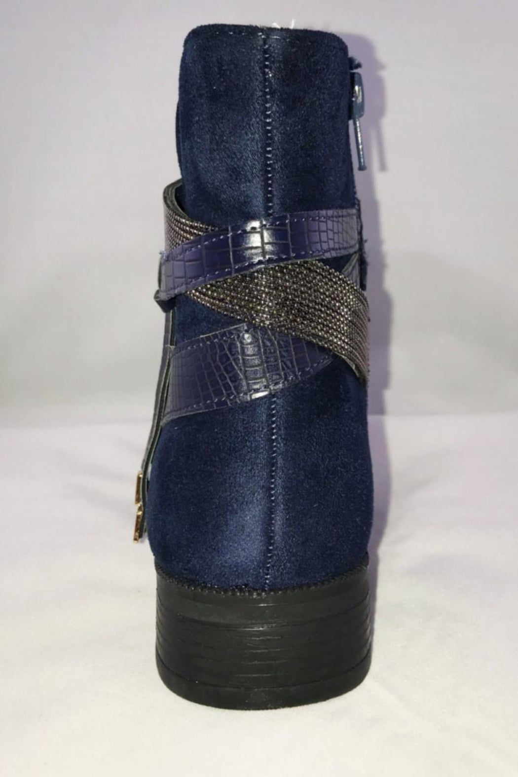 Faux suede booties in navy or black are an essential for your fall or winter wardrobe! Embellished detail around the ankle. They pair easily with jeans and look cute with a dress! Inside zip for ease of putting on or taking off. Small block heel.