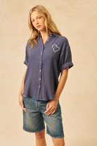 This slate-blue button-up shirt is crafted from 100% cotton in a textured gauze fabric with a lightweight, crinkled finish. The relaxed-fit shirt features a collar, front button closure, and rolled short sleeves for a casual look. What makes this piece special are the delicate white embroidered hearts—a small one on the chest and a larger statement heart on the back—adding a sweet, whimsical touch. The shirt is styled with distressed denim bermuda shorts, creating an effortless summer outfit that combines comfort with subtle feminine details.