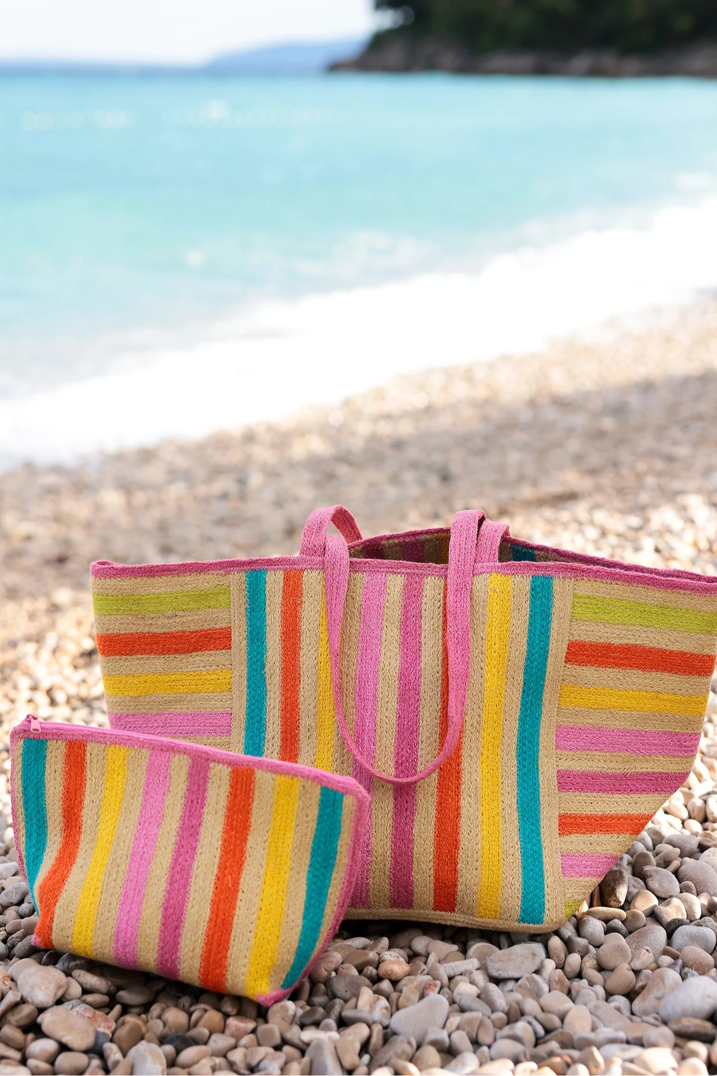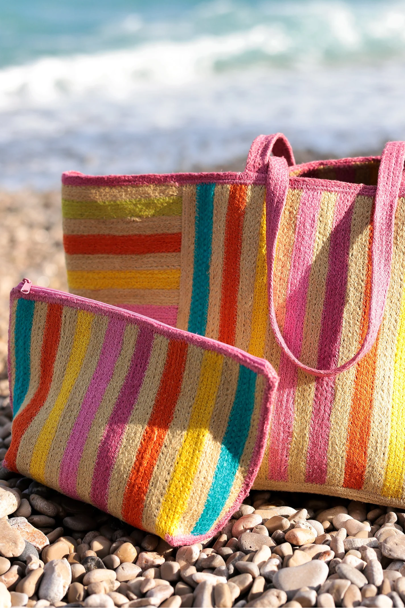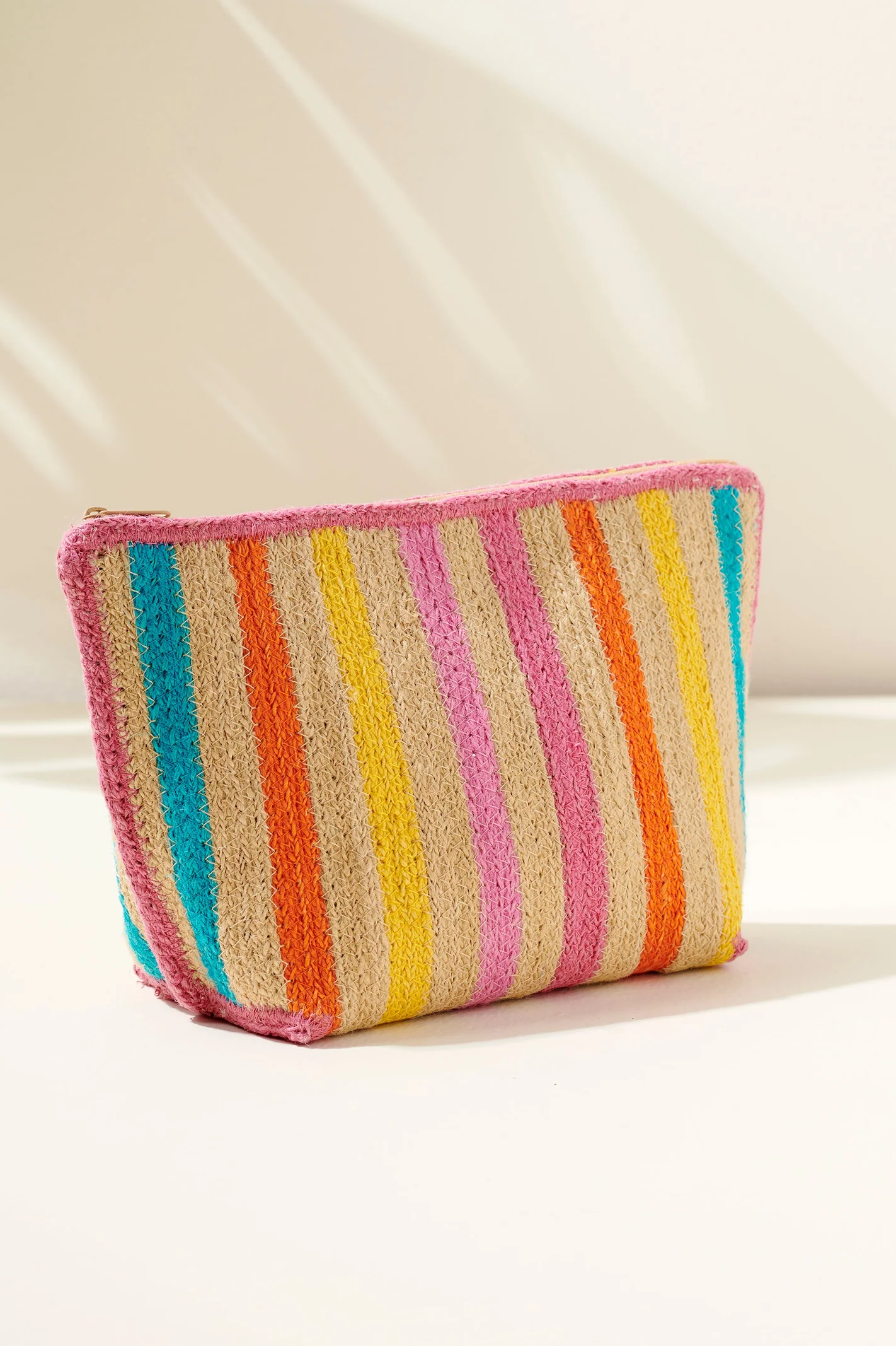 Say hello to sunshine with the Fifi Zip Pouch, a perfect mix of stripes and smiles. Bursting with vibrant colors like pink, orange, turquoise, and yellow, this pouch is a chic companion for your beach days, errand runs, or organizing your essentials in style. Crafted with durable materials and a playful design, it's as functional as it is fabulous, keeping your sunscreen, makeup, or small trinkets secure in one bright package. Pair with the Fifi Totw to complete a beautiful set!