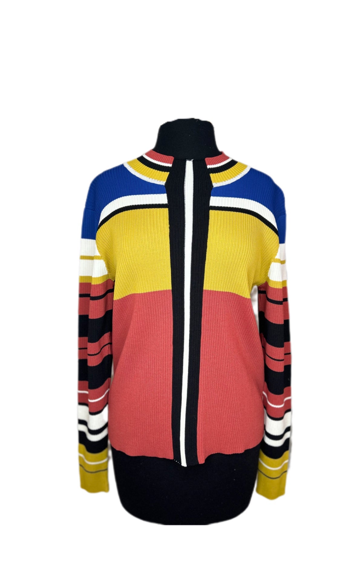 •LOOK: This designer inspired , bold color-blocked sweater gives your mood a boost. Everyday wear pullover plays with colors and angles to highlight its rugby-style stripes and ribbing.