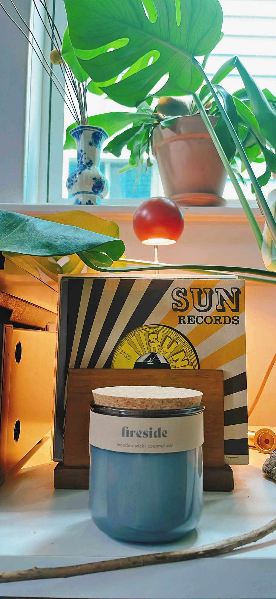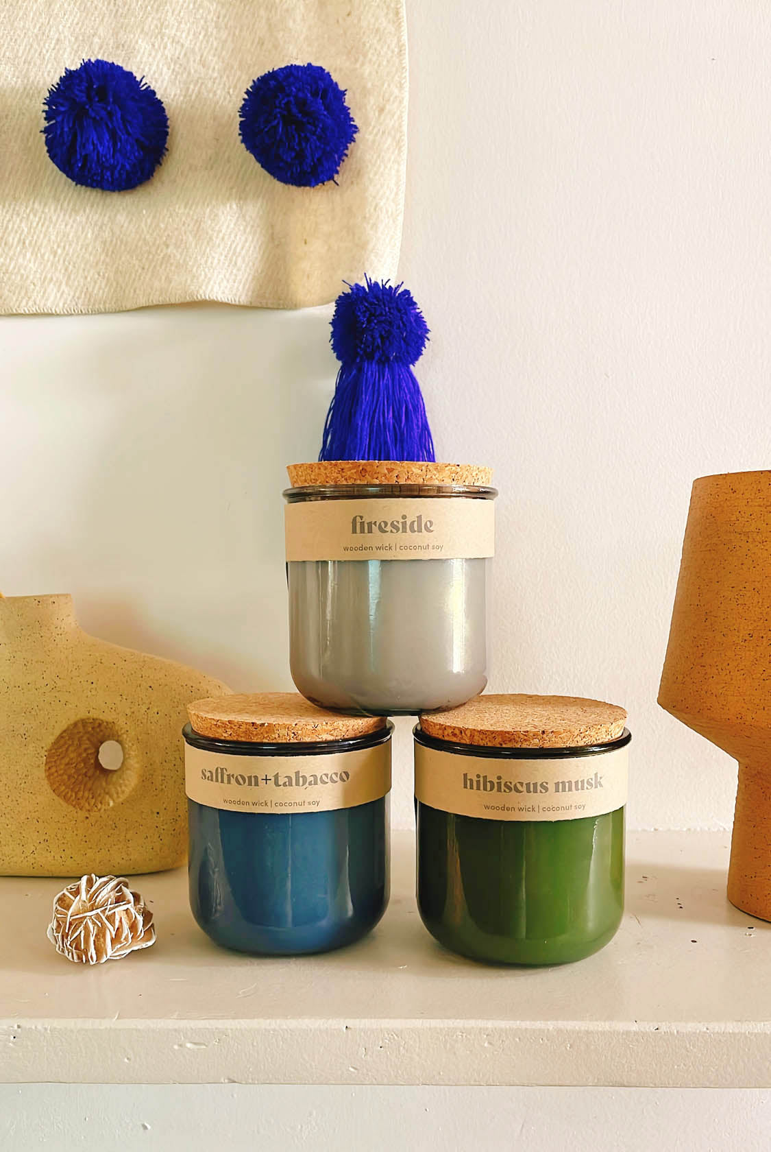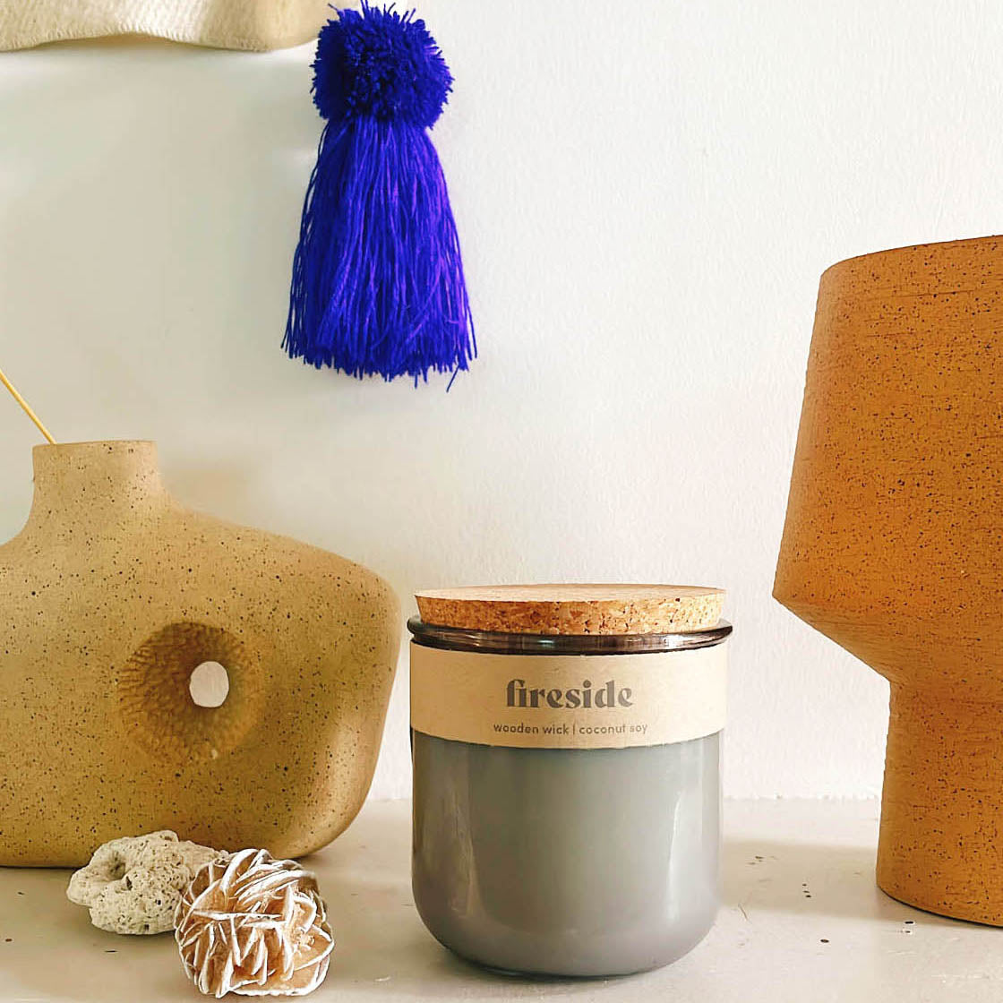 Fireside y'all. You might know it & love it already - It's simply the best. Cozy, warm, & perfect for the holidays - or any time you need some extra cozy in your life. This version has a cork top, an FSC-certified wooden wick, & comes in a 100% recycled, grey glass jar.