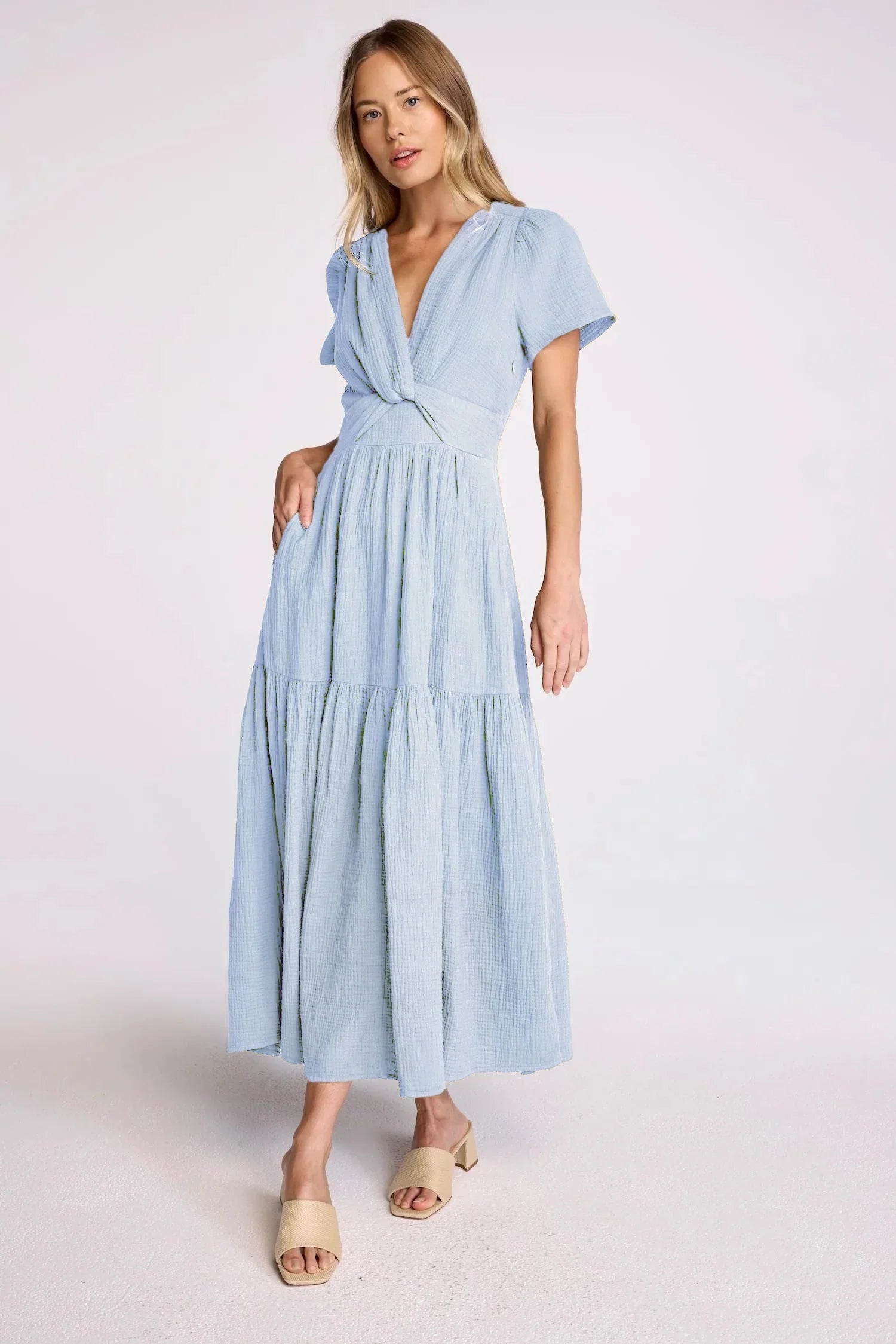Introducing the Fleet Dress: a breathable cotton gauze dress with a twist front and flowy short sleeves. With its tiered skirt and ankle-length finish, this must-have piece exudes elegance. Stay comfortable and stylish with this versatile dress.