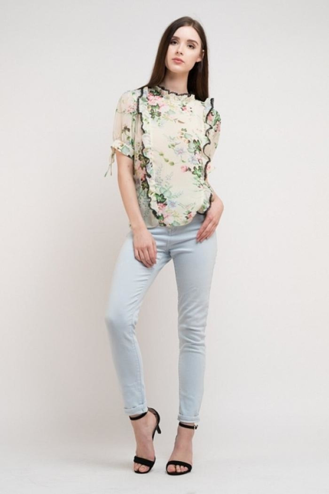 Beautiful floral top features multi colored floral design with black trim accents. Ties behind the neck and at the sleeves. Would pair beautifully with a black tulle skirt! Fit runs small as the top does not have any stretch. Hand wash cold, hand to dry.
