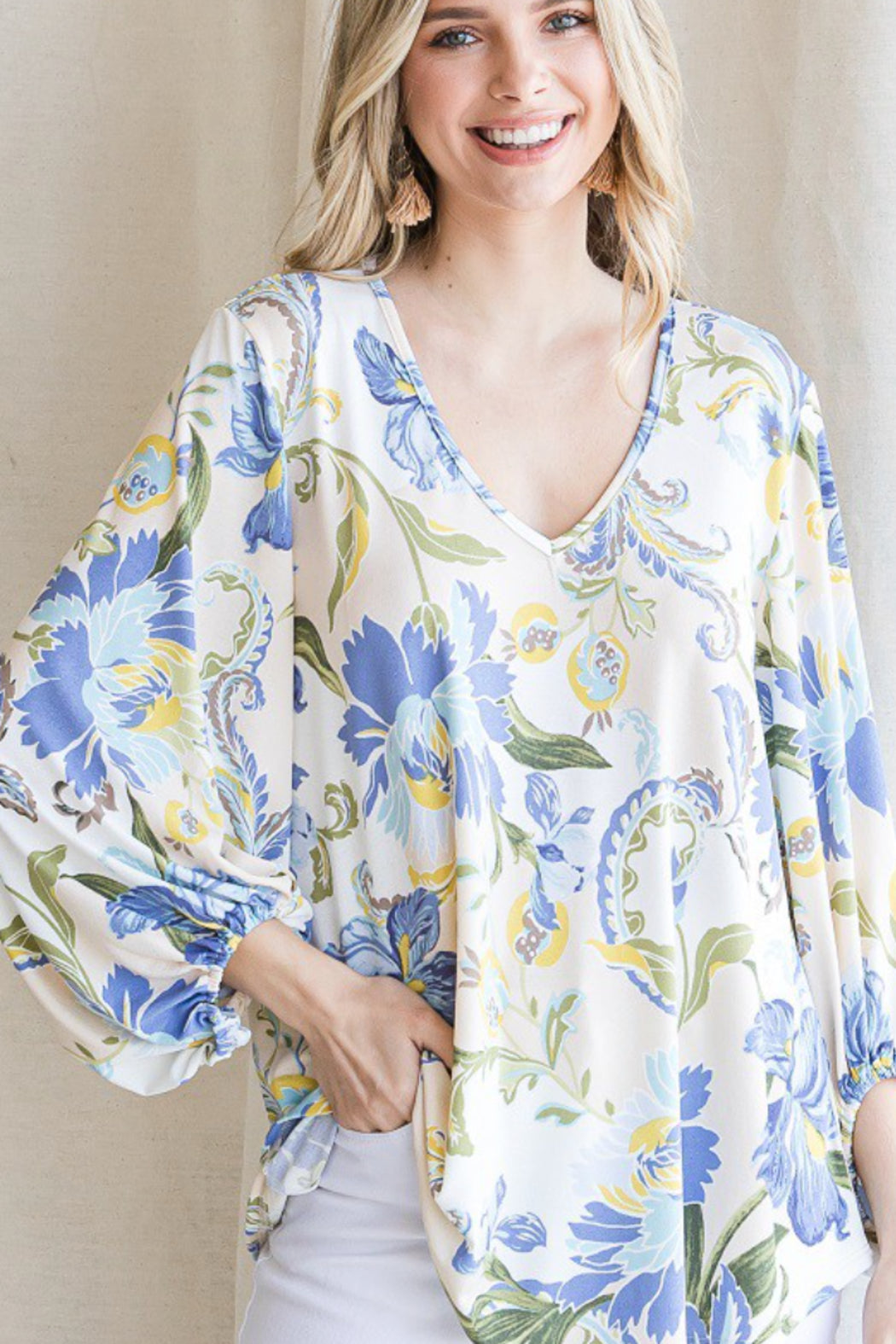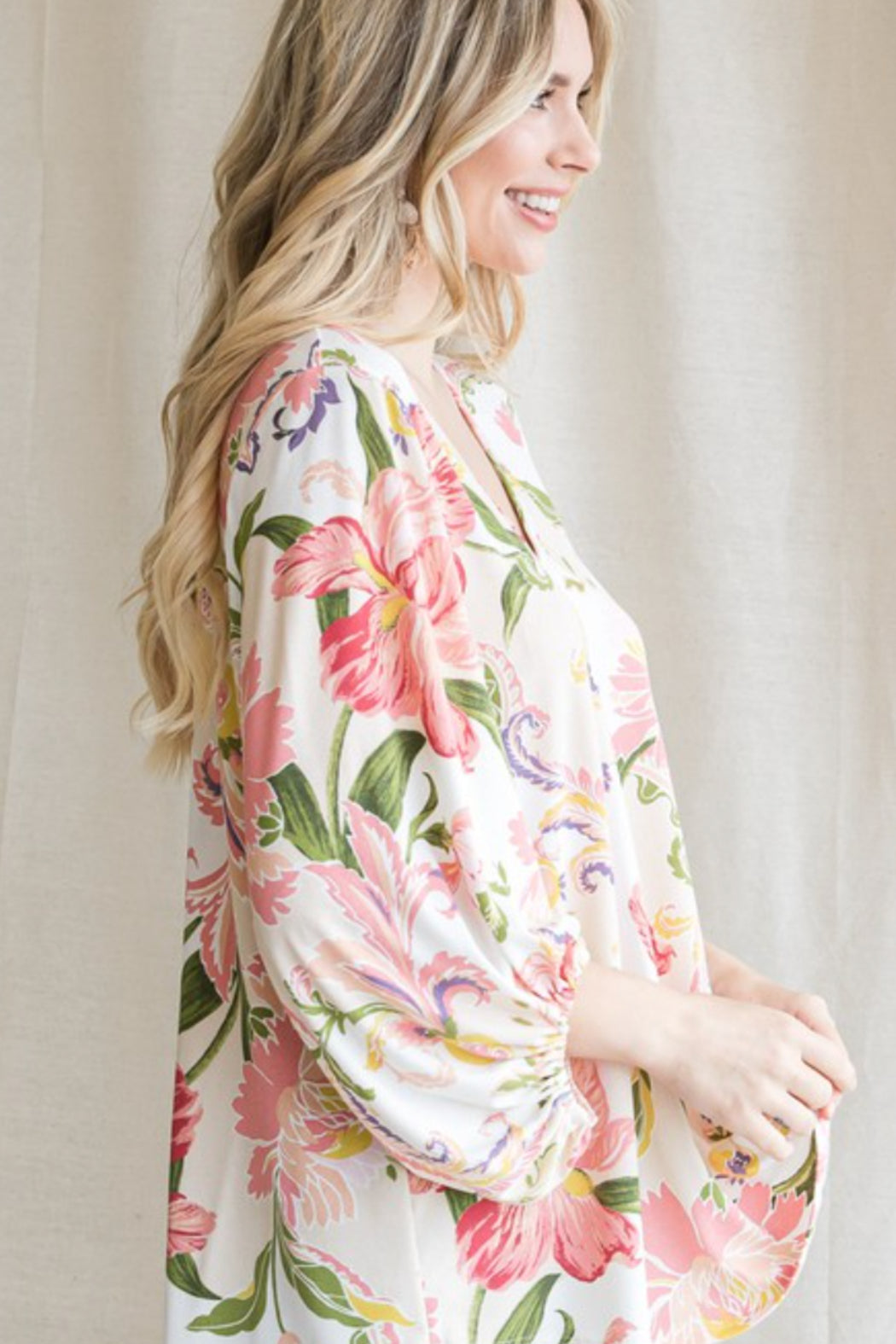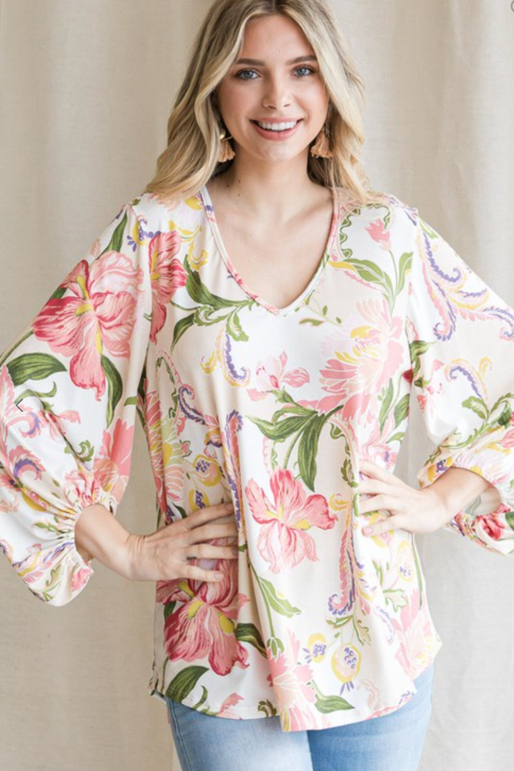 Floral print top with a V-neckline and three quarter draped bubble sleeves.