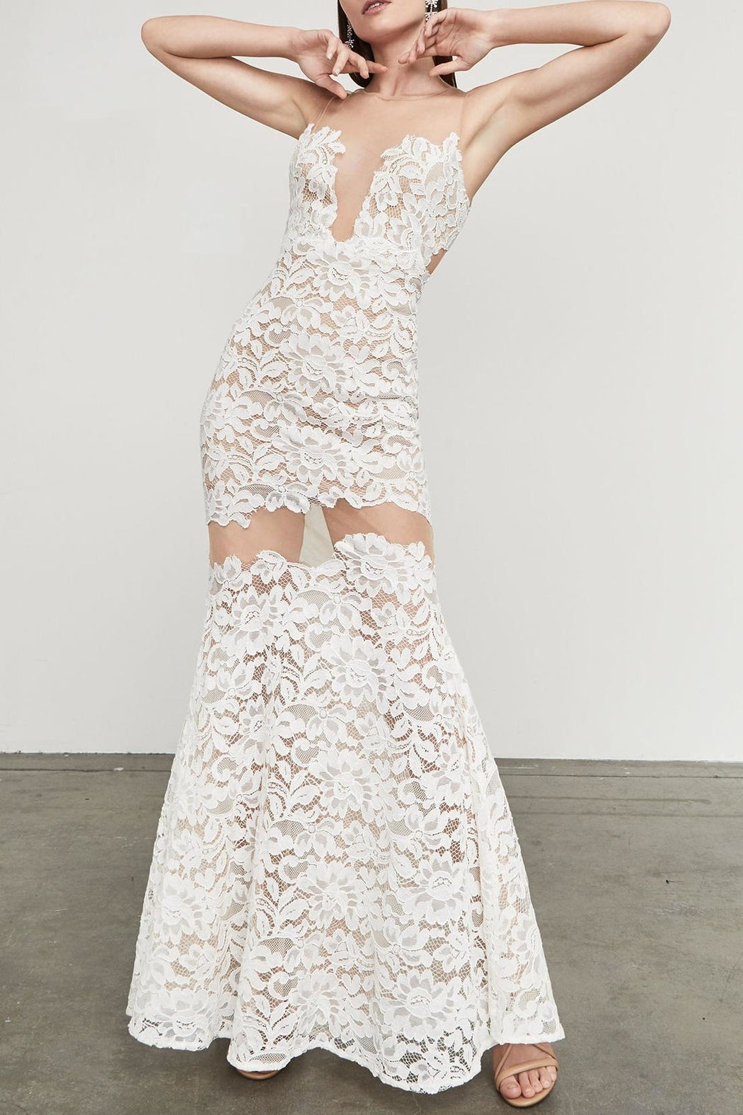 Heads will turn the instant you enter in this formfitting gown crafted from intricate floral lace that features a stunning lace and illusion panel décolletage and sensual open back design.