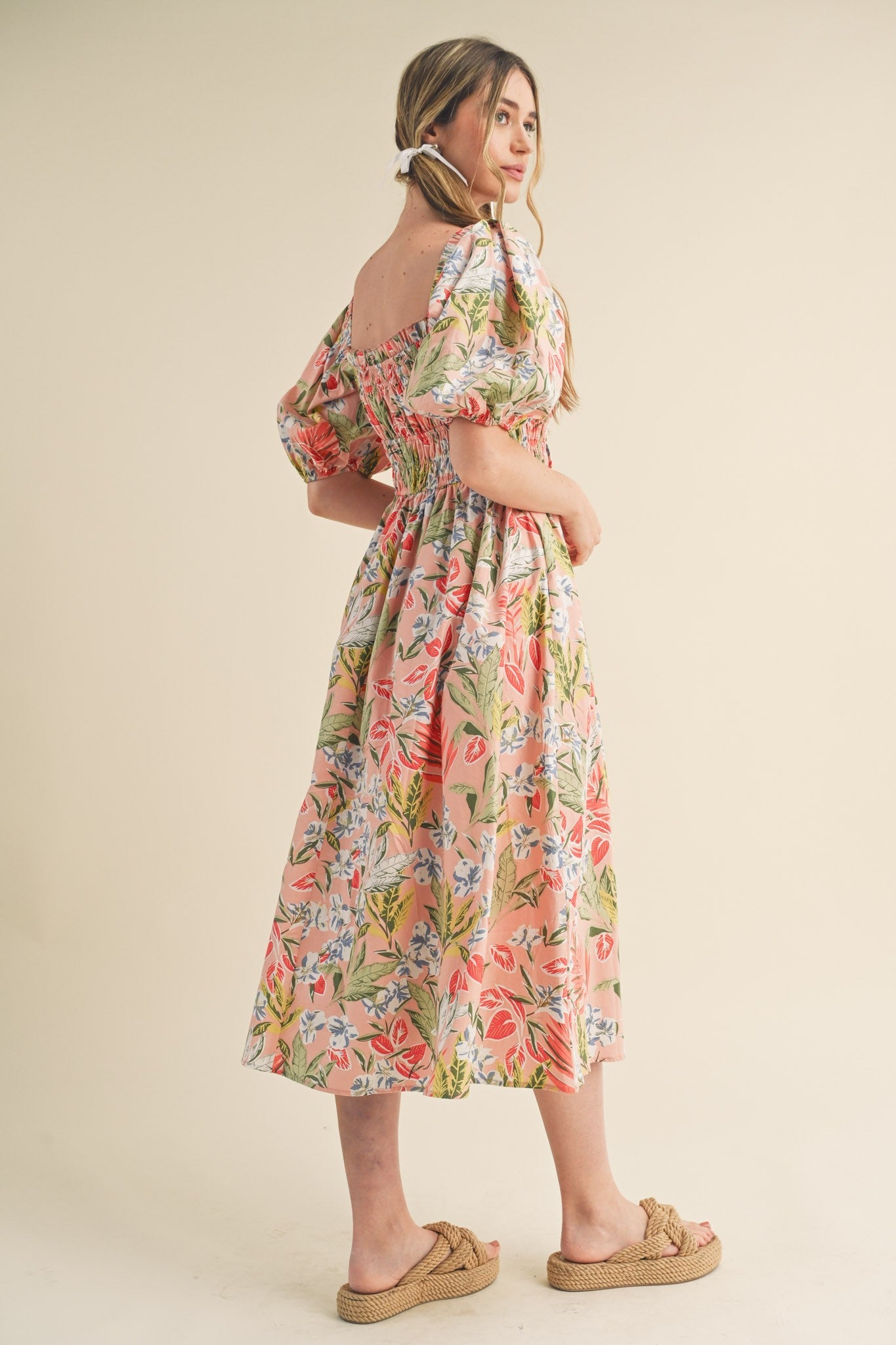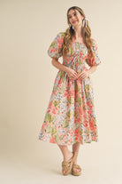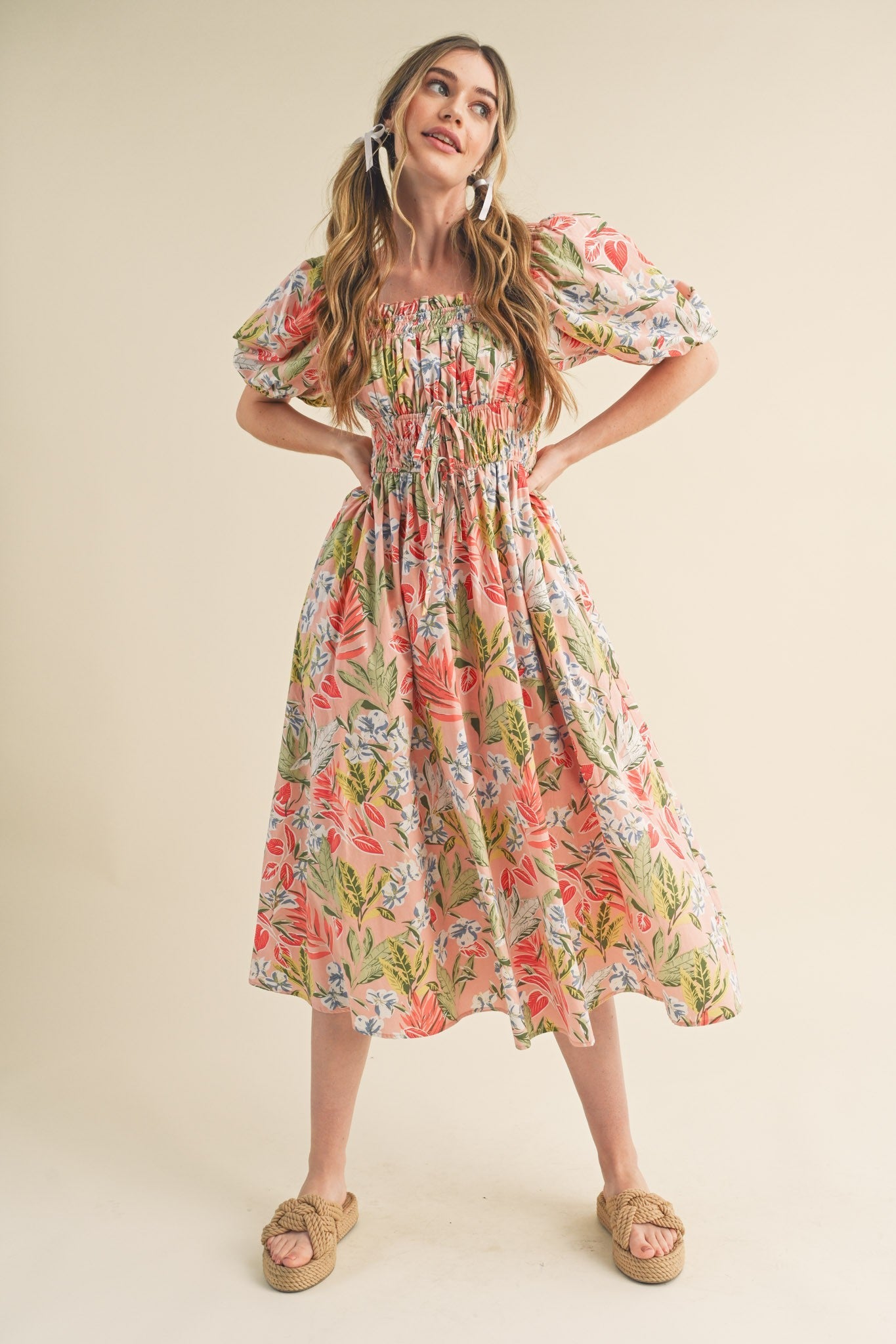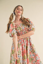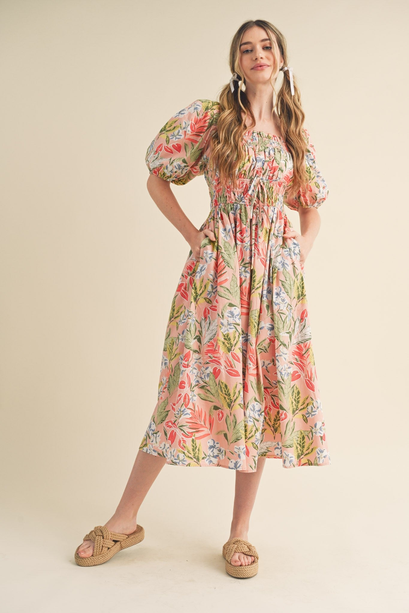 This fabulous floral midi dress features a ruffled square neckline, tiered elastic waist panel with tying detail, and short puff sleeves with elastic cuffs. Plus, it has the added convenience of pockets and is fully lined for ultimate comfort. Say hello to your new go-to dress for any occasion!