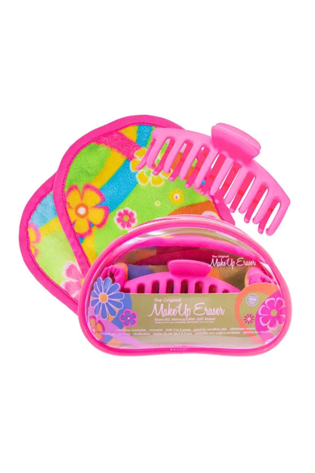 Flowerbomb Set includes: 1 full-size MakeUp Eraser approx. 15.5in x 7.25in, 1 claw clip, & a reusable makeup bag.