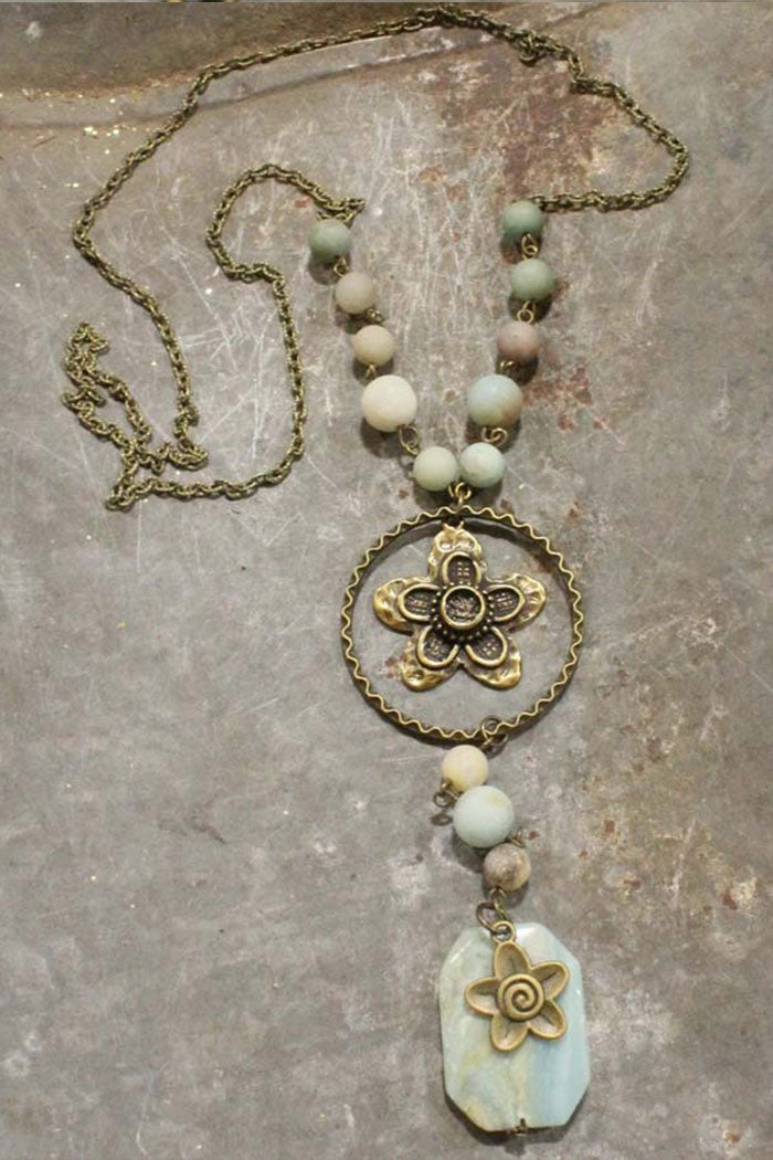 Always in Bloom Bronze Flower & Mint Stone Necklace.