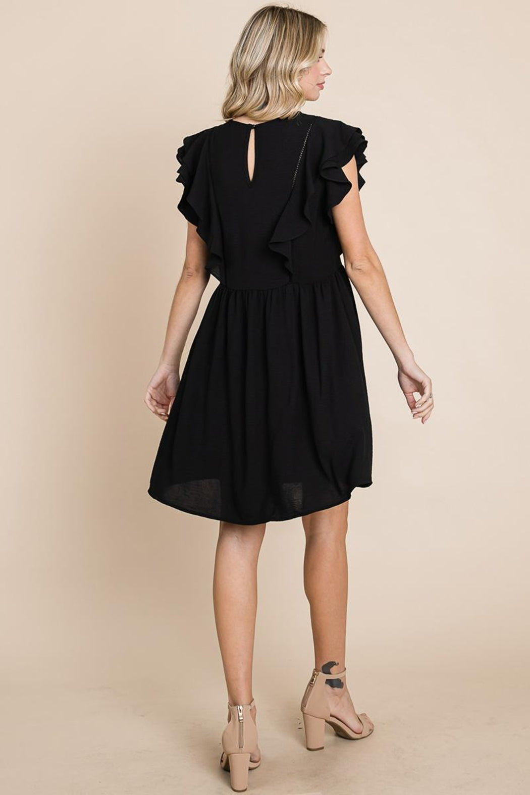 Features: Butterfly Ruffled Sleeve, Ruched, Stretchy Air Flow Fabric, Back Keyhole, Mini Length
