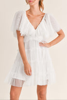 Elevate your style with our Flutter Sleeve Ruffle Mini Dress. The Swiss dot mesh tulle adds a touch of elegance and the ruffle tiers create a playful yet sophisticated look. The lining ensures comfort while the flutter sleeves and shoulder detail make it the perfect dress for any occasion.