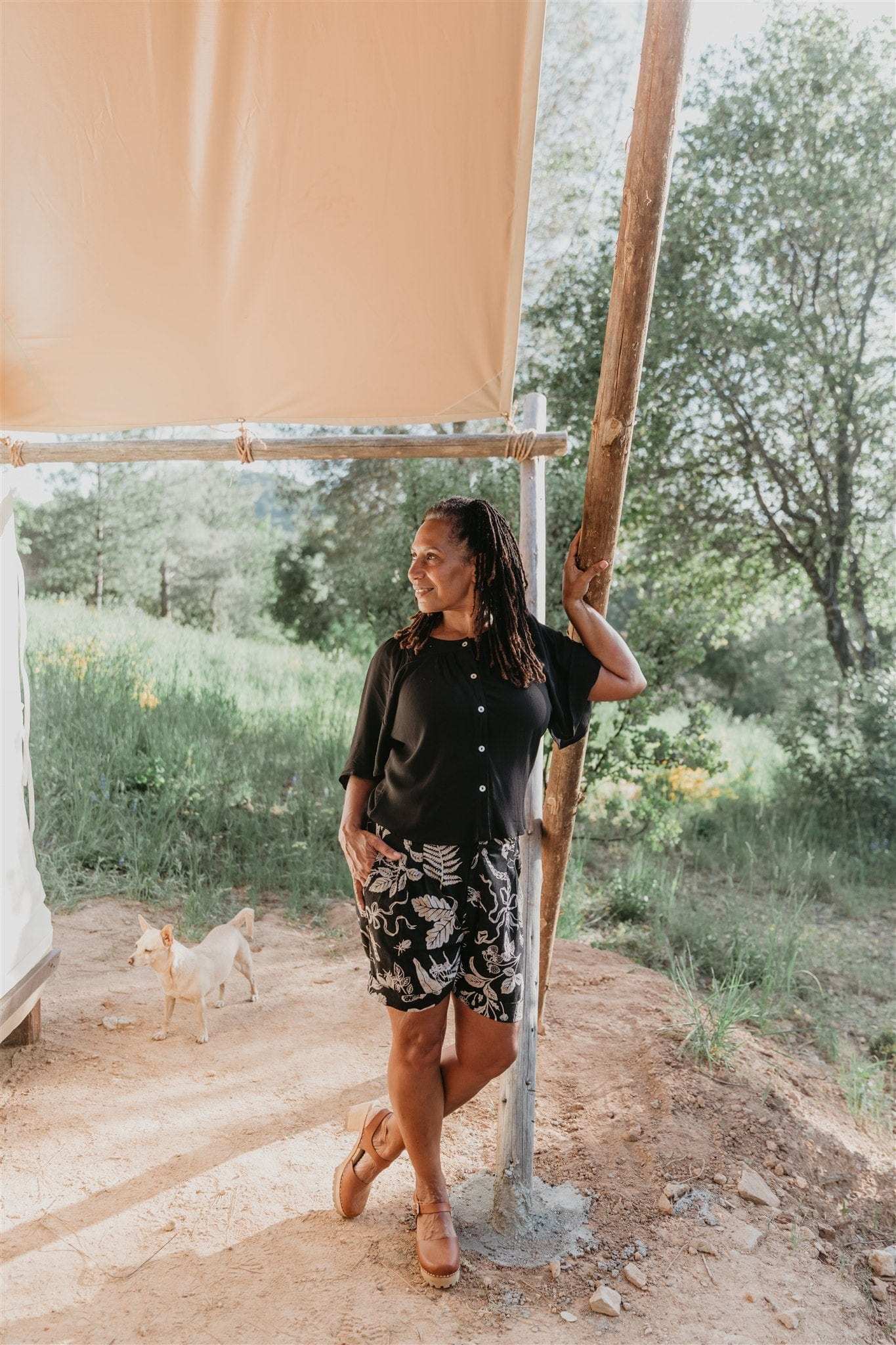 Features a double lined front and back yolk design. Oversized butterfly sleeves that hit just above the elbow. 5 deadstock mother of pearl functional buttons. You can fold down the lapel for a lower cut look.