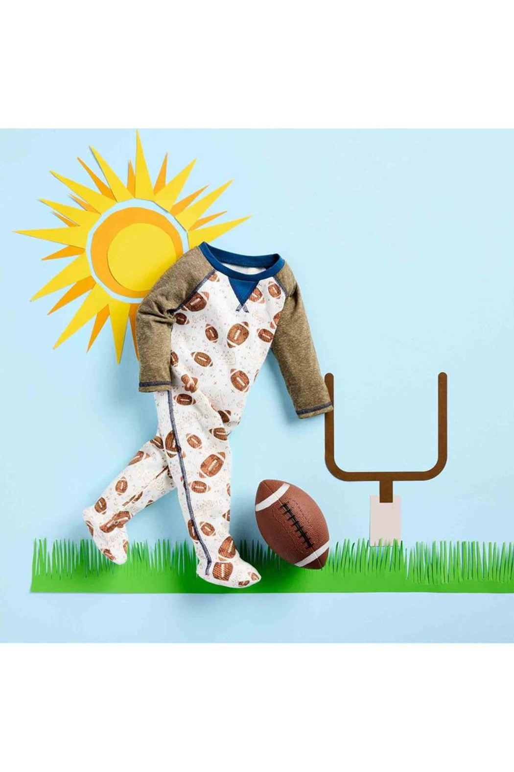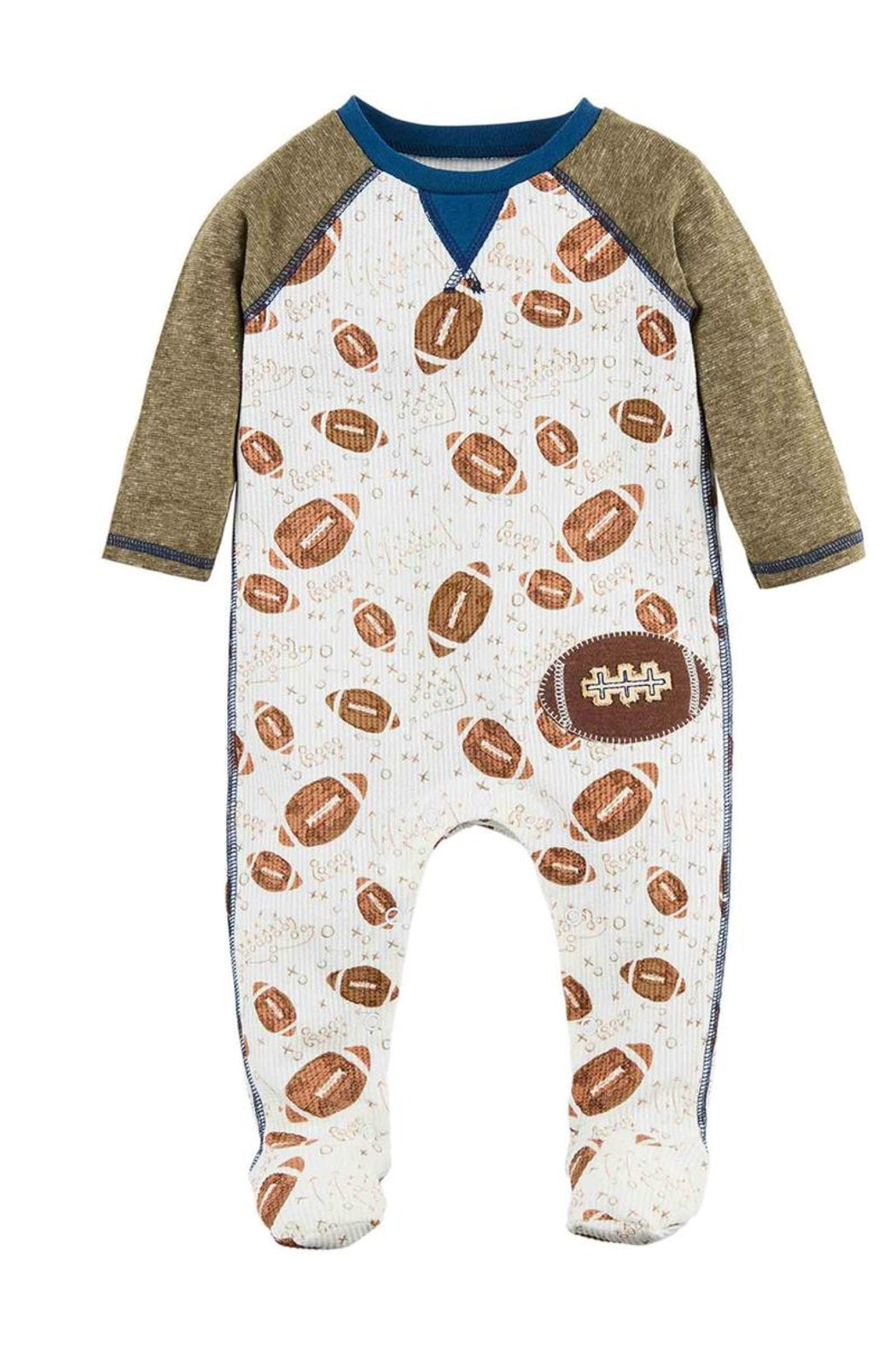 Appliquéd waffle weave footed sleeper features cotton slub raglan sleeves. Inner leg snap closure.
