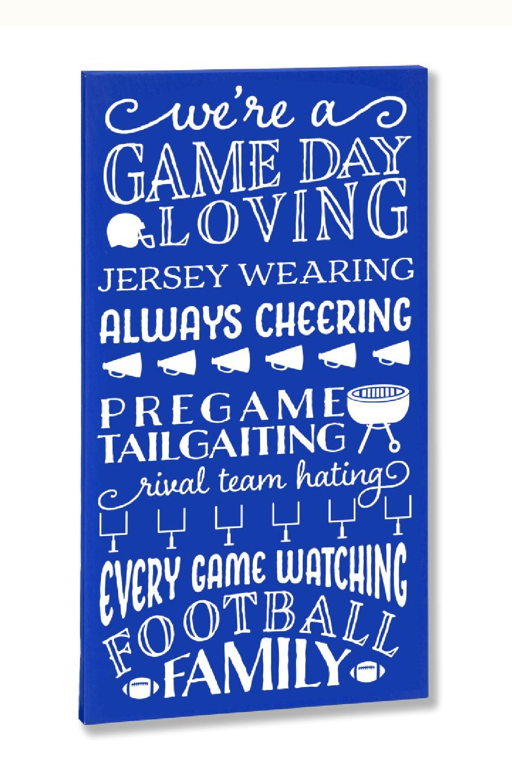"The Game Day Loving" canvas is perfect for any football fan or family of fans! This canvas comes in royal blue with white letters and with a metal hook on the back for hanging. Made sturdy with a wood frame and thick canvas, it measures approximately 10" x 1.5" x 19."