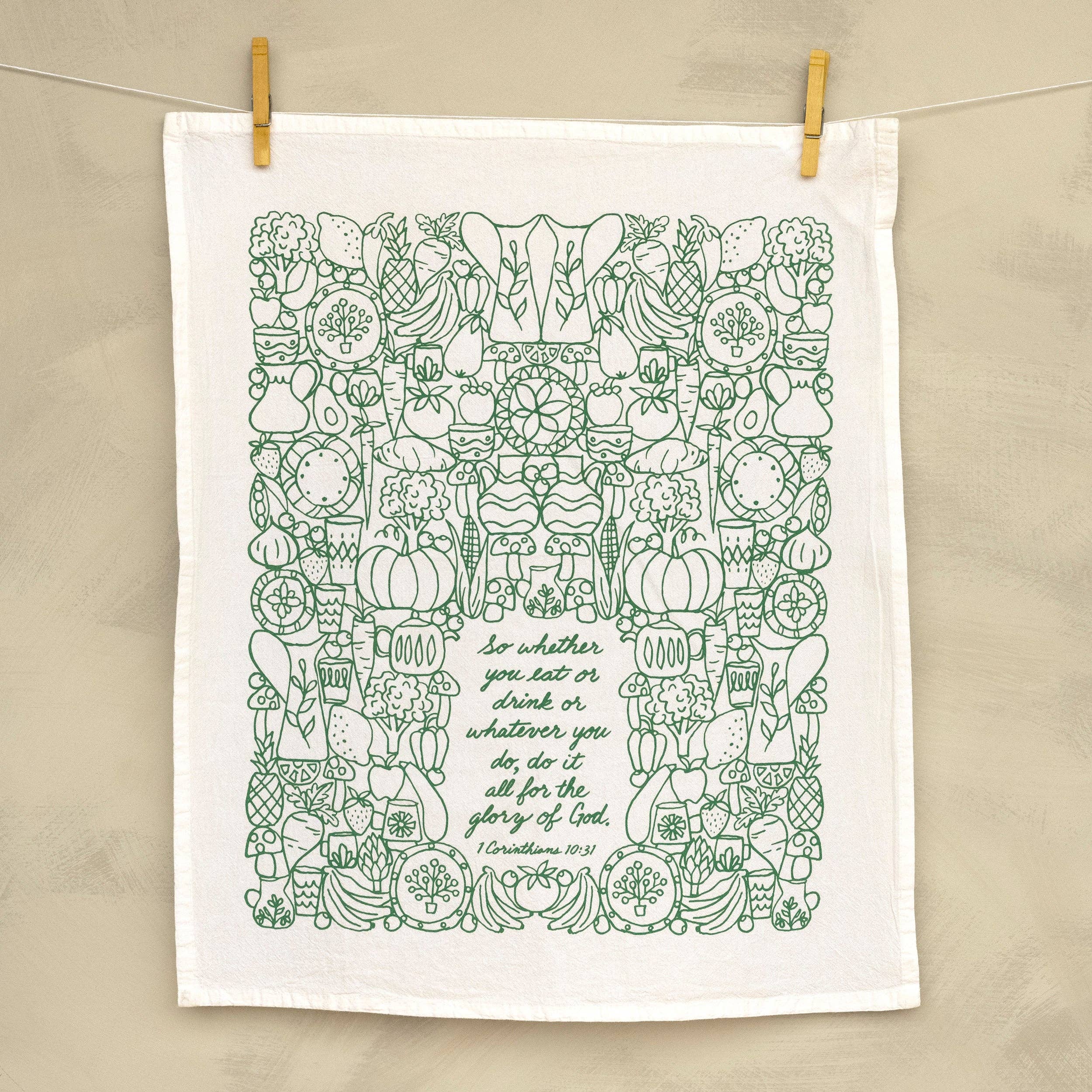 Our tea towels brighten your home with color and truth. The For the Glory of God Scripture tea towel is printed in forest green and features 1 Corinthians 10:31. Made of 100% cotton, these flour sack tea towels easily and cost-effectively replace disposable paper towels with high absorbency and durability. Generously sized, lint free, and made to last a lifetime. Illustrated by Kate Whitley.