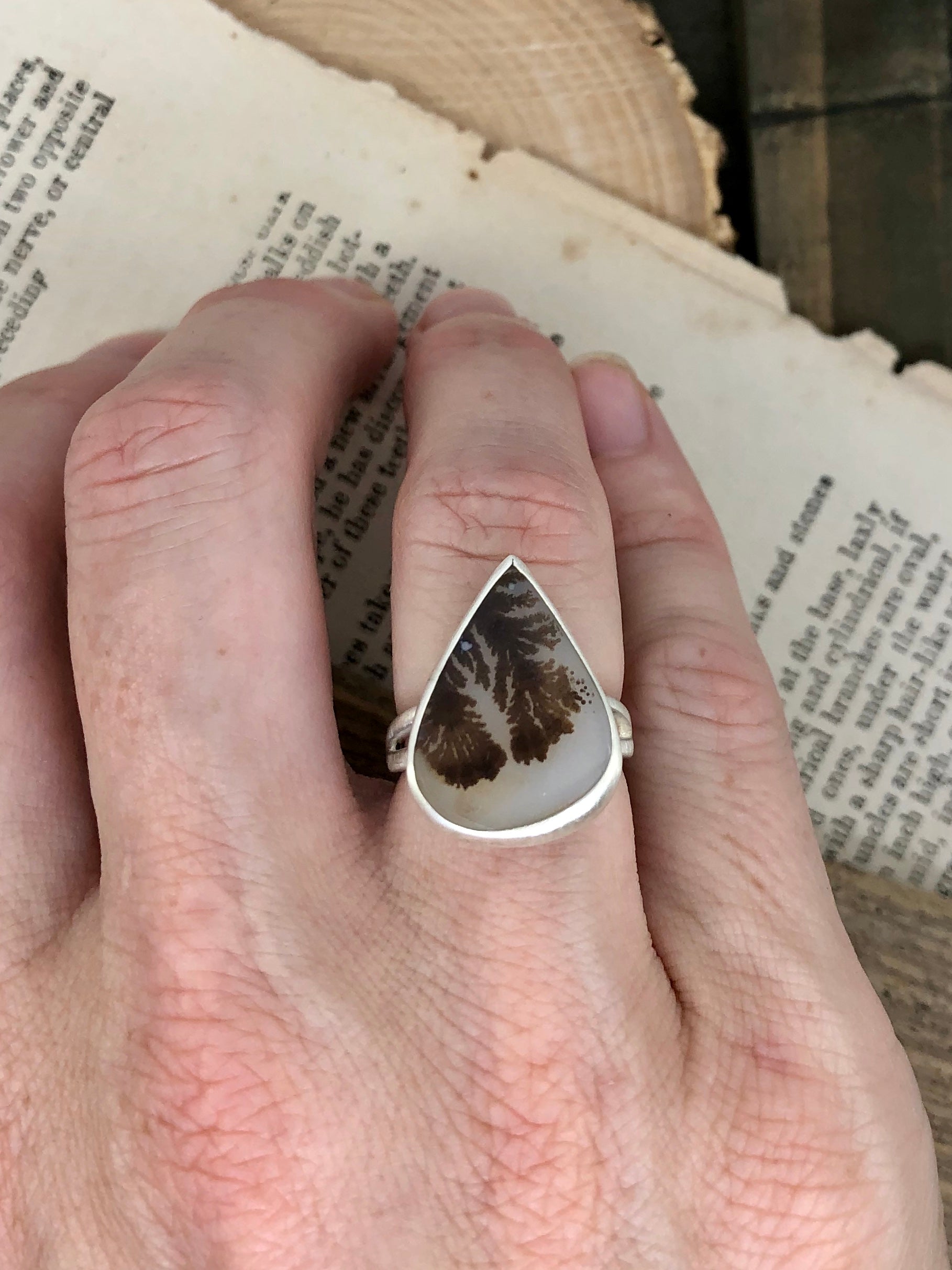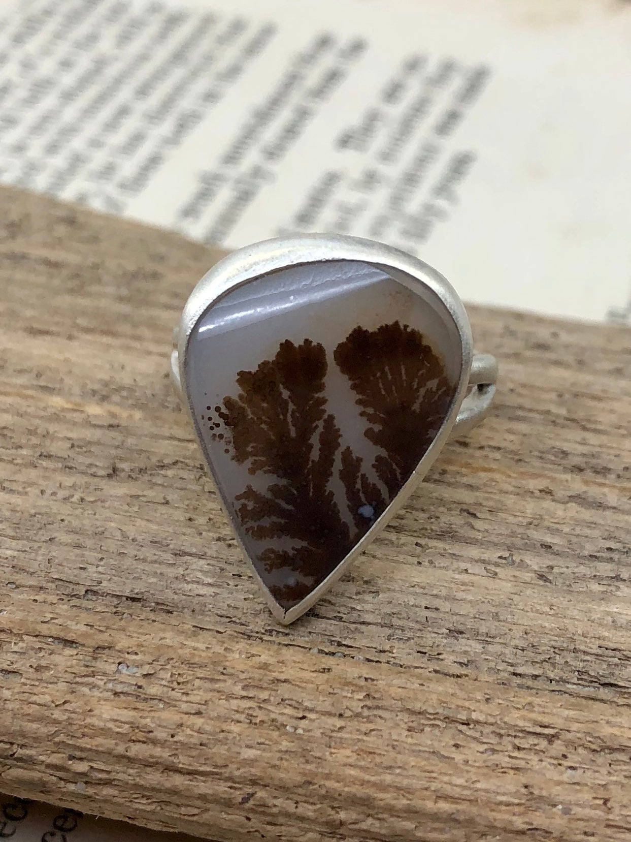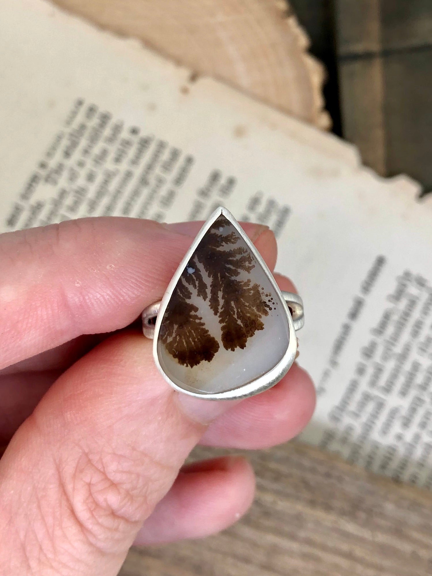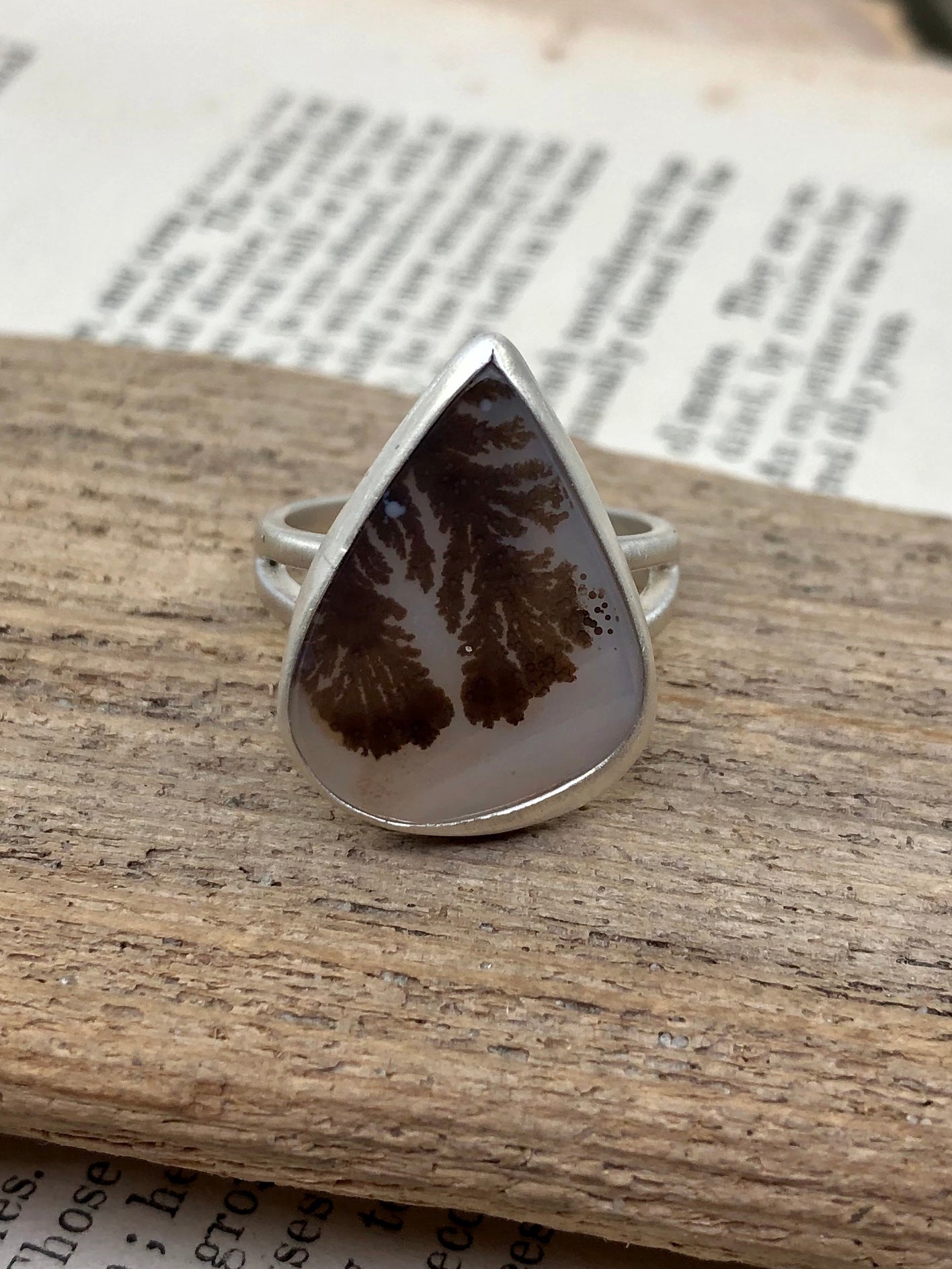 An incredible, one-of-a-kind teardrop of dendritic agate teardrop is set in fine silver to showcase its stunning landscape. Finished on a hand -forged sterling ring shank. Size 5.75. Custom sizing available upon request.