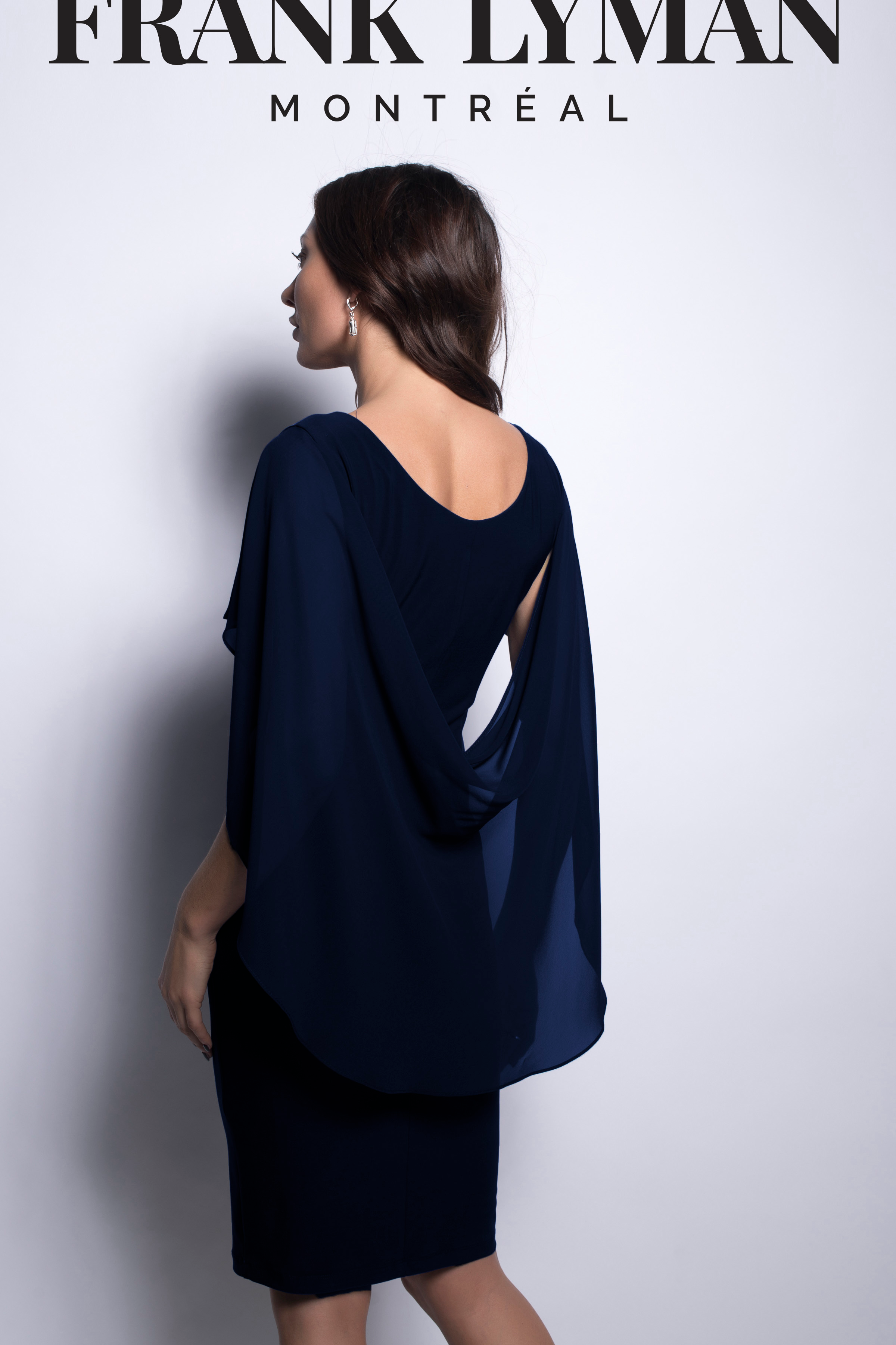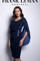 This is a gorgeous knee length sheath dress that is perfect for both semi-formal and formal occasions. It has a round neckline with ruching detail and rhinestone embellishments. This dress is so flattering and comfortable you won't want to take it off.