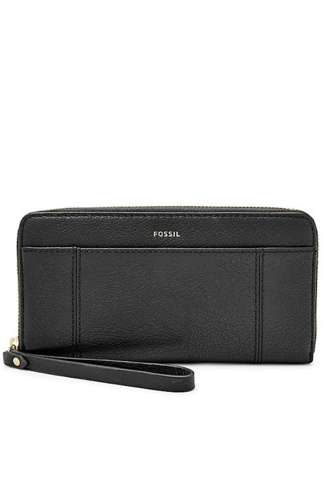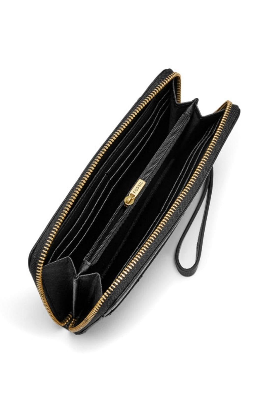 Here is the Fossil Leather Jori Clutch Wristlet in Black. Keep your style and identity in check with Jori, their newest RFID clutch. Fossil's leather is known for its softness and its ability to look good over time. They have designed this product with a special lining to protect your RFID chips in your credit and debit cards from unwanted scanning. On the exterior is 1 back zipper pocket, full top zipper, and Old English brass hardware. There is also a leather wristlet strap and gold stamped signature detail. On the interior are 2 bill compartments, 12 credit card slots, and 1 zipper coin pocket dividing two pleated compartments. Dimensions: 8" wide x 4" high x 1" deep with a 5" leather wrist strap.