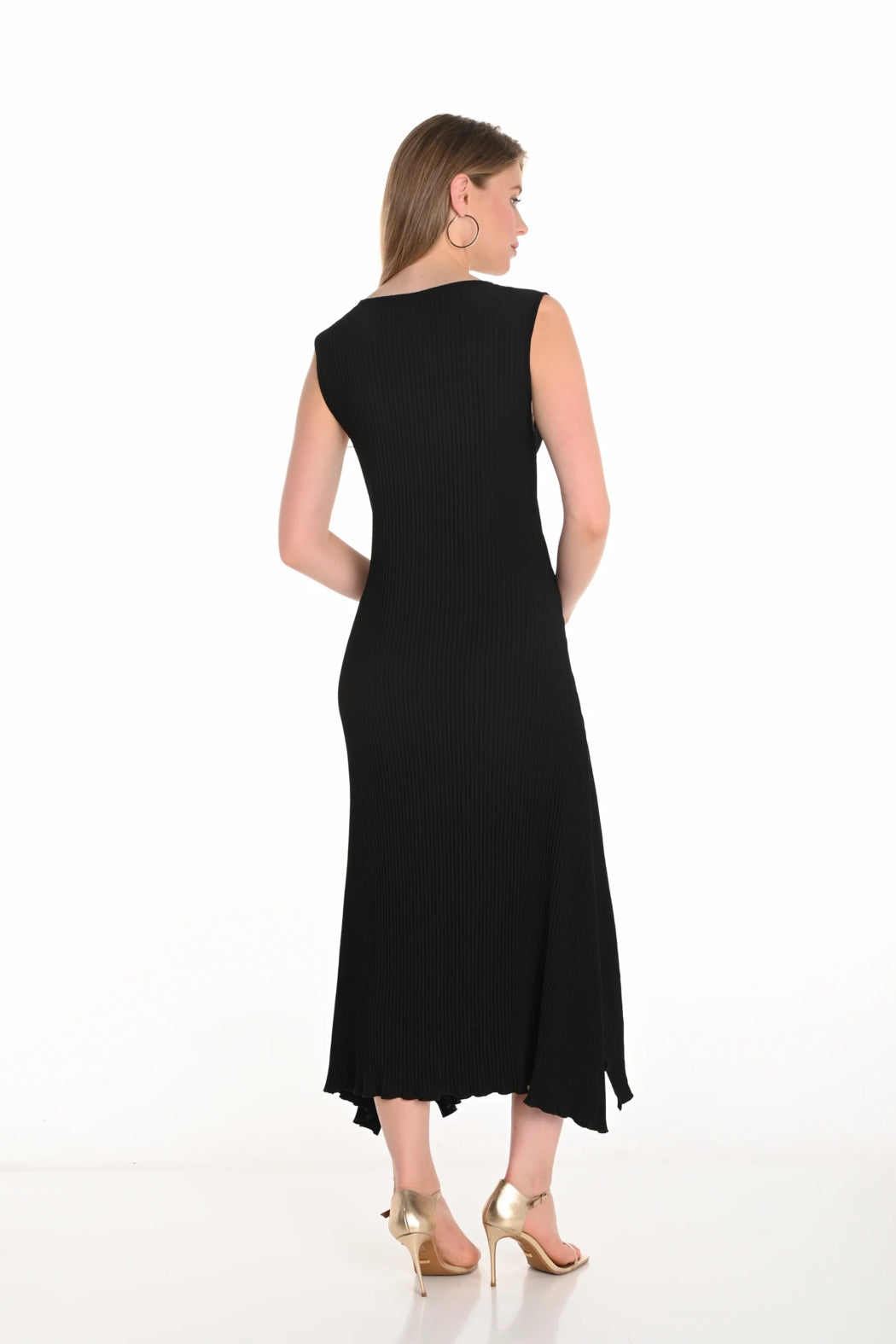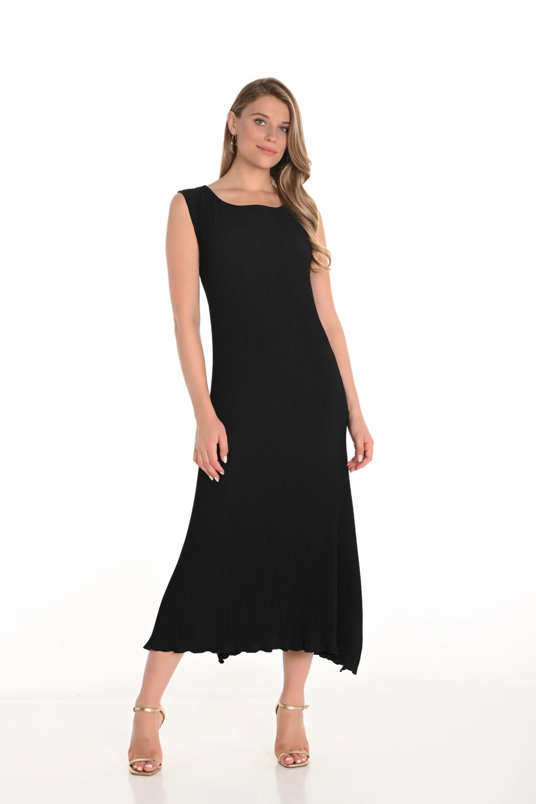 This sleeveless black midi dress from Frank Lyman brings timeless sophistication with a modern twist. Crafted from a finely pleated fabric, it drapes beautifully over the body, offering both structure and fluidity. The asymmetrical handkerchief hem adds dynamic movement, making it a standout piece for both casual and dressier occasions. Pair it with heels for a polished look or dress it down with flats for effortless daytime style.