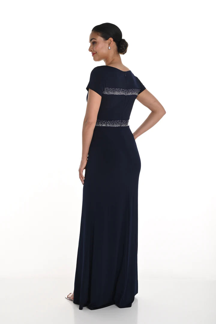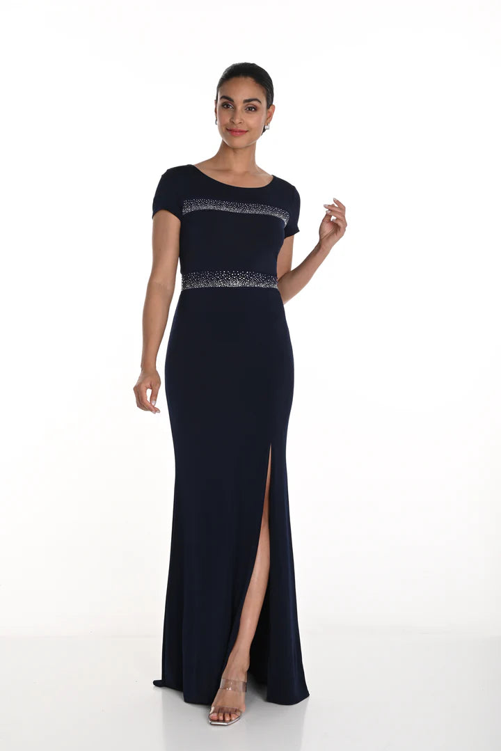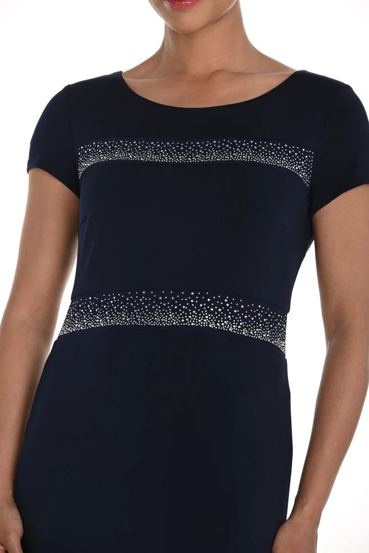 This is a gorgeous classic fit and flare dress with a short cap sleeve and a sleeve. It has little rhinestone details that gives the dress a timeless glamorous look. It has a blend of polyester and elastane which will be comfortable to wear all day long. This is the perfect dress for any semi-formal or formal occasion you may have coming up.