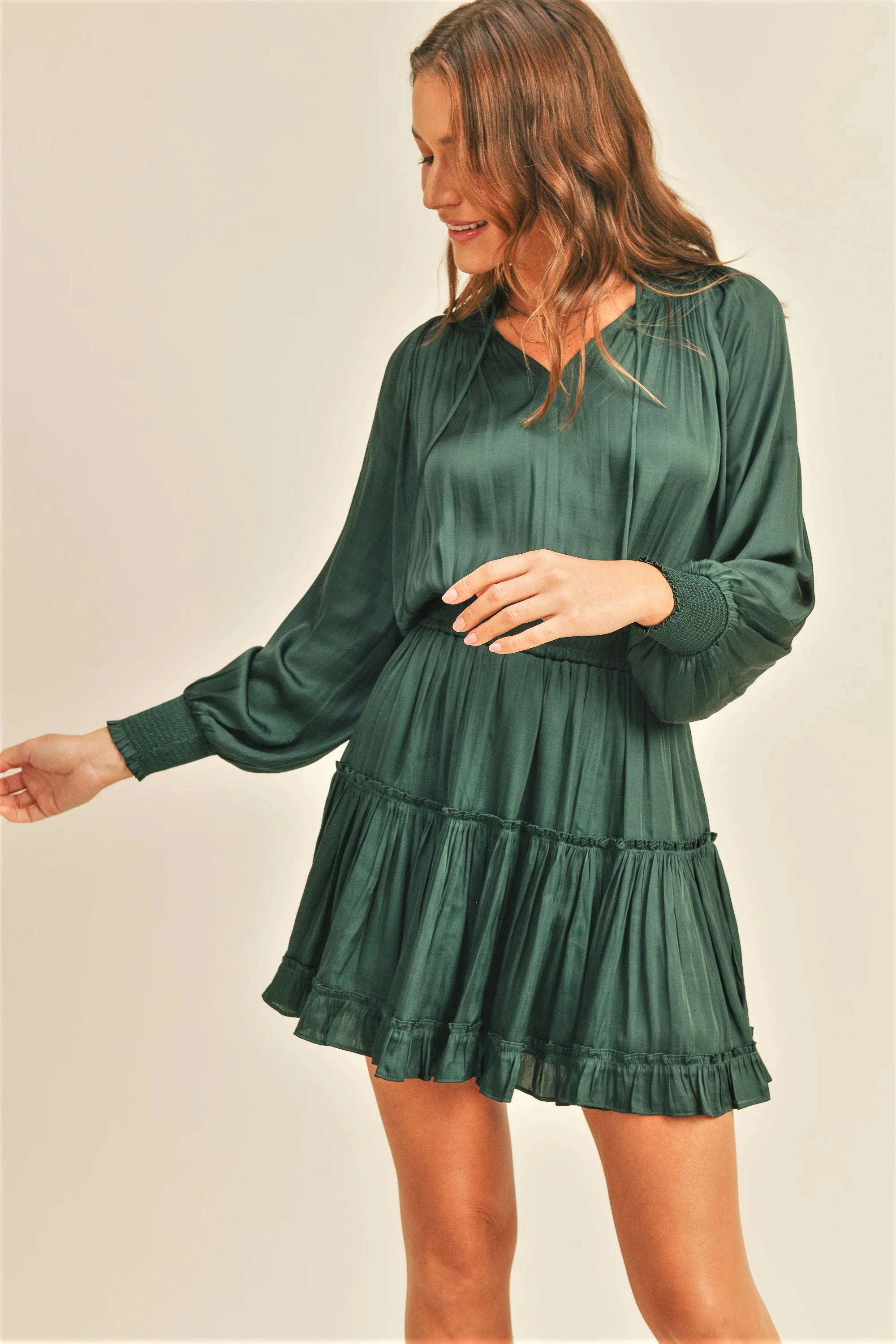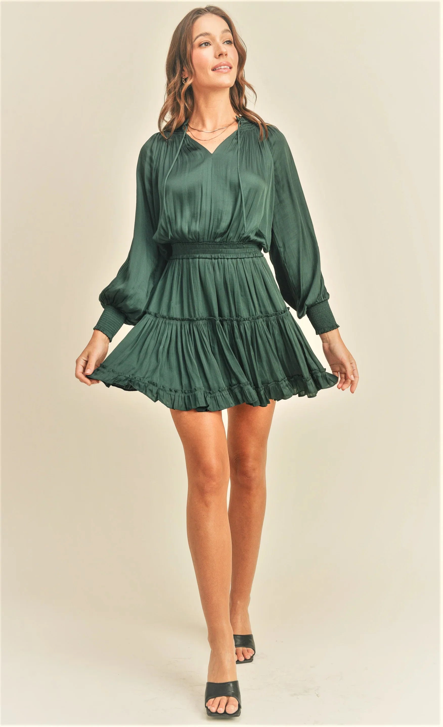 The Frankie dress is a must-have with its chic V-neck and balloon top, accented by ruffle detailing throughout. The elastic waistband and cuff smocking at the waist create a flattering cinched effect, while the tiered ruffle skirt adds a playful touch. Perfect for any occasion, this solid color mini dress boasts a loose fit and flounced flowy skirt.