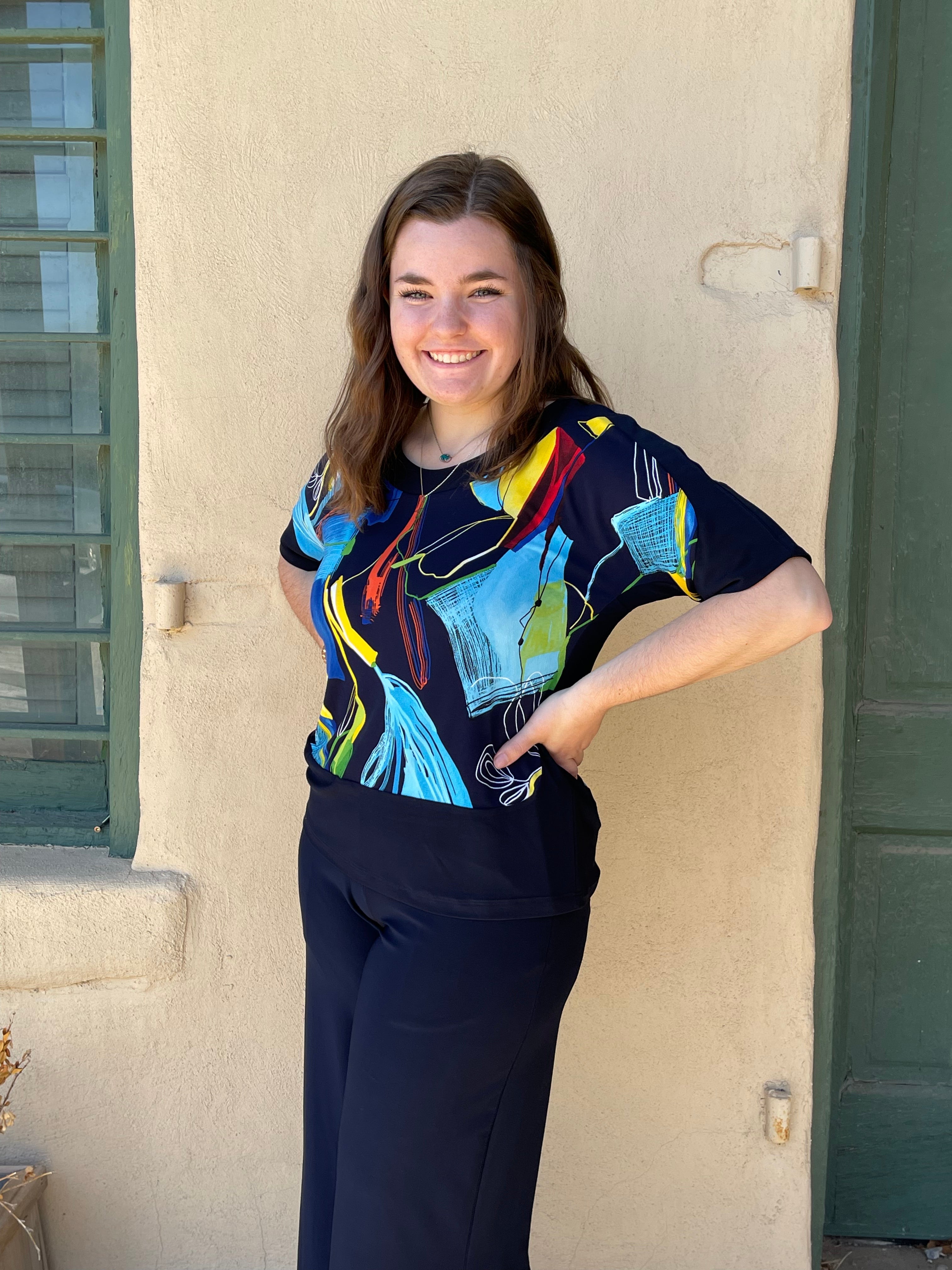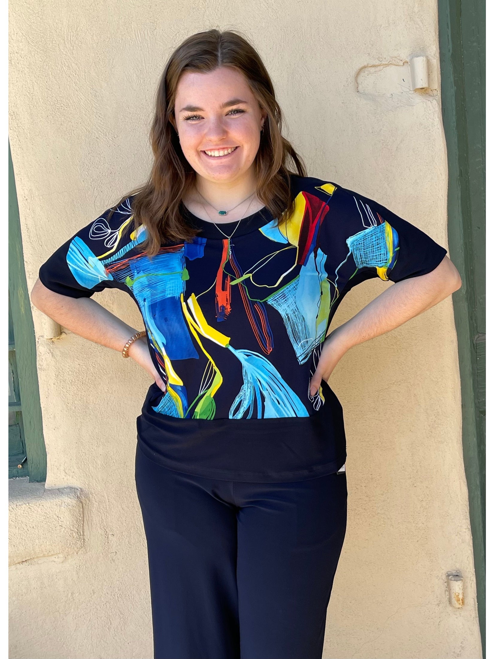 The Frannie Deep Sea Top by Artex Fashions is an exclusive statement piece that will elevate any wardrobe. Featuring an abstract deep sea print, elbow length short sleeves, and a comfortable, wrinkle-resistant fabric, this top is the perfect way to add a luxurious artistic touch to any outfit.