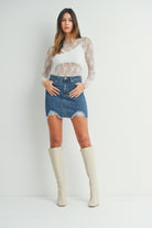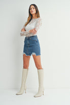 Get ready to rock this Highly fashionable A-line mini denim skirt! With its high waist and medium wash denim, you'll be ready to stand out in style. The front frayed hem adds a touch of edge and destruction to your look. Perfect for any occasion.