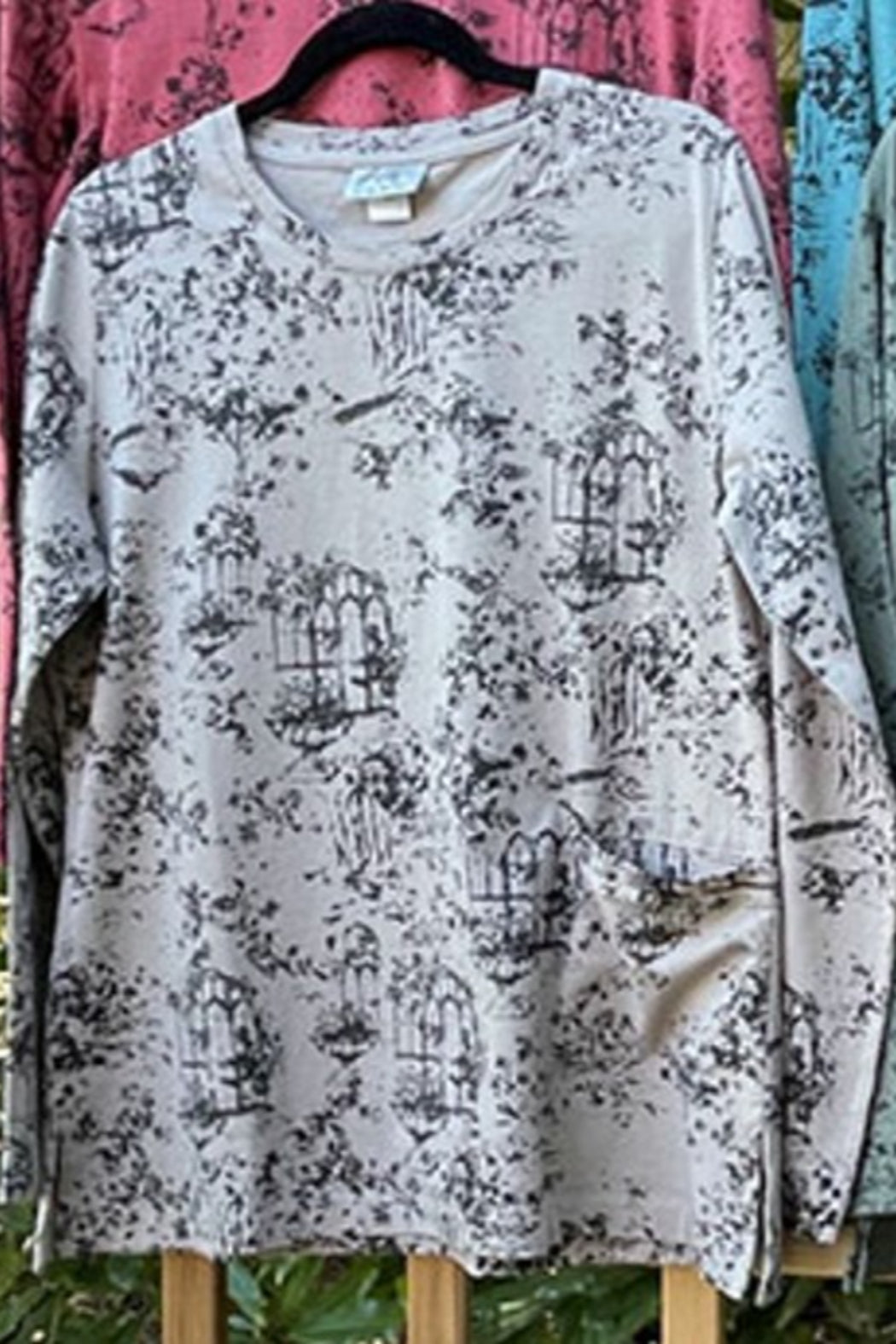 A simple, soft cotton tee pullover with long sleeves and a scoop neckline, this one really shows off this print! It's a toile pattern with a French scene that typically has a repeated pattern depicting a pastoral or natural scene with flowers and landscapes.