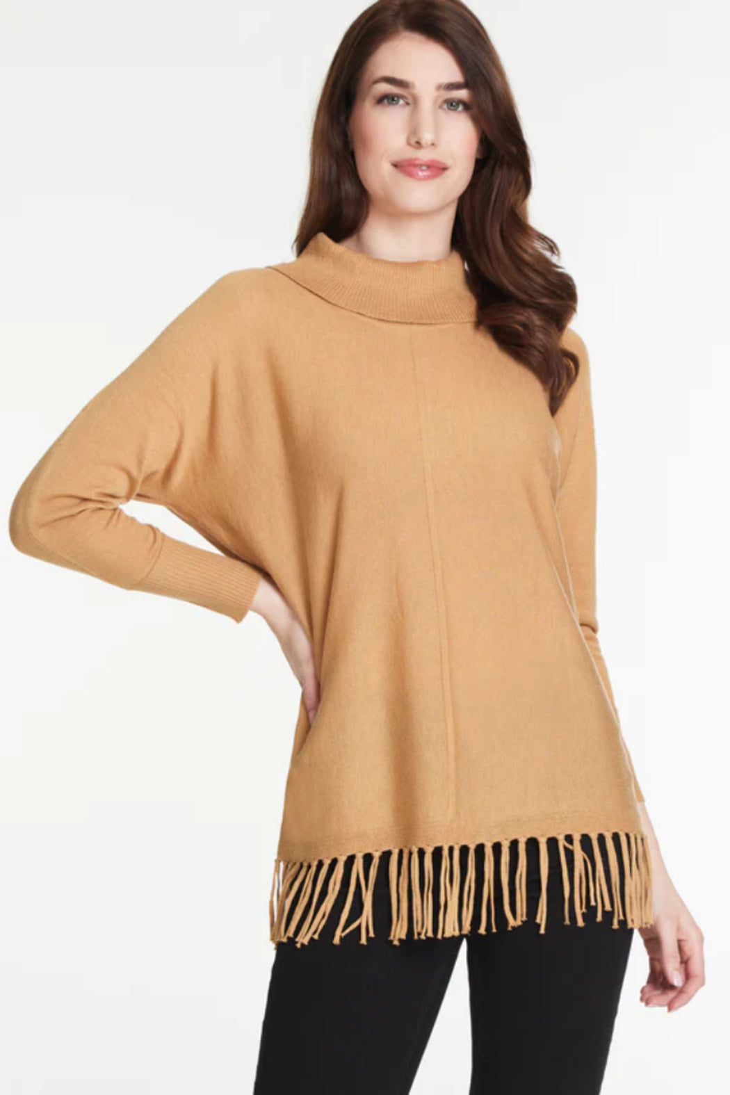 Nice transitional sweater features dolman sleeves and a cowl neck with fun fringe hemline from front to back. Lightweight fabrication can easily take you from winter into spring.