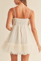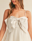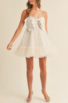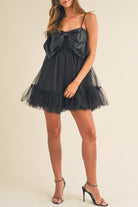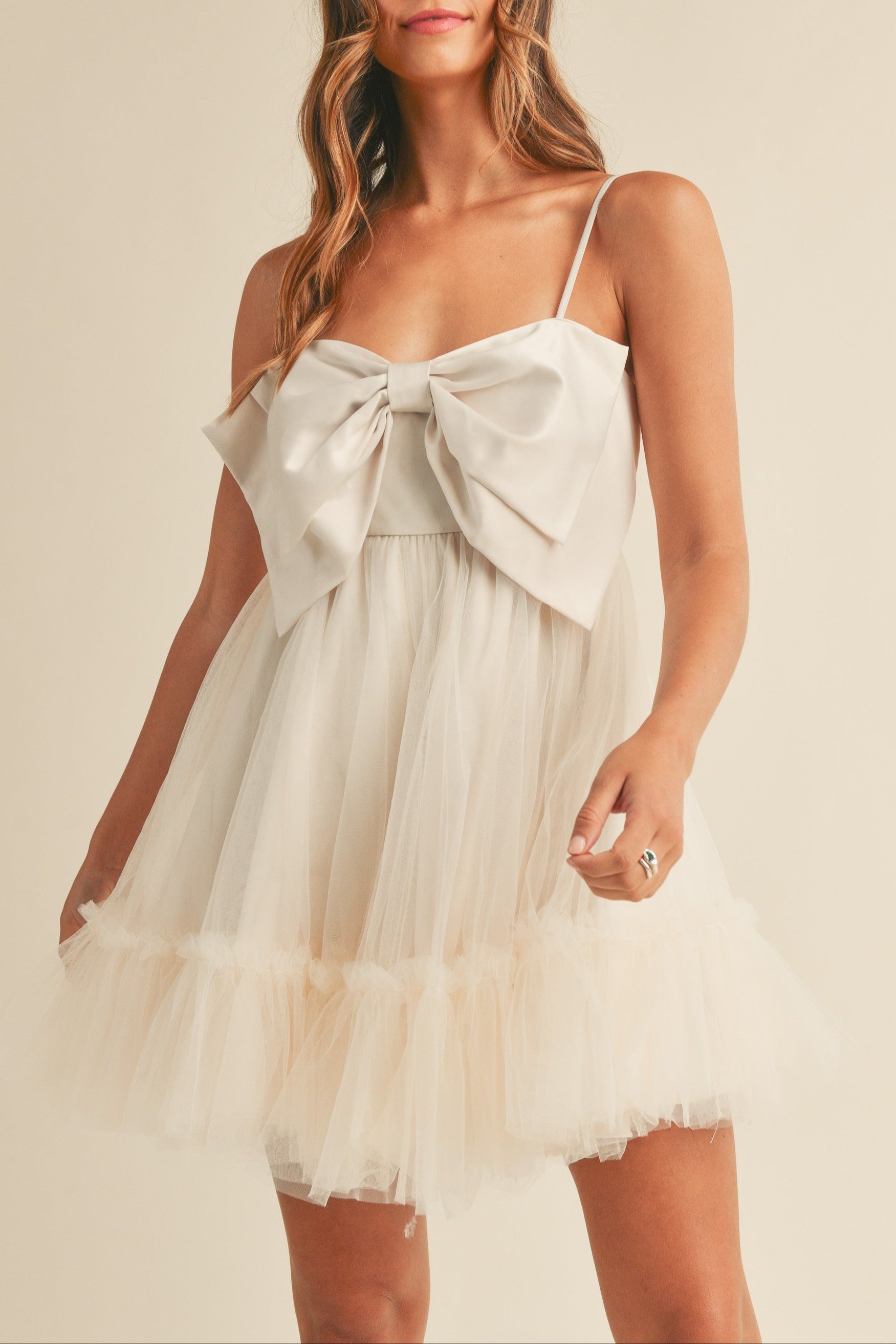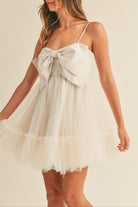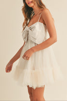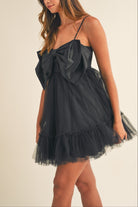 This flirty mini dress has adjustable spaghetti straps and a charming front ribbon bow. The tulle mesh skirt adds a touch of whimsy. With a comfortable lining, you'll feel confident and carefree in this babydoll dress.