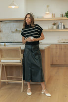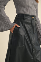 This pleather skirt combines edgy sophistication with classic elegance. The front slit adds a hint of allure, while the A-line design ensures a flattering fit for every body type. Perfect for both day and night, it can easily be dressed up with heels for a chic evening look or paired with sneakers for a more casual vibe.