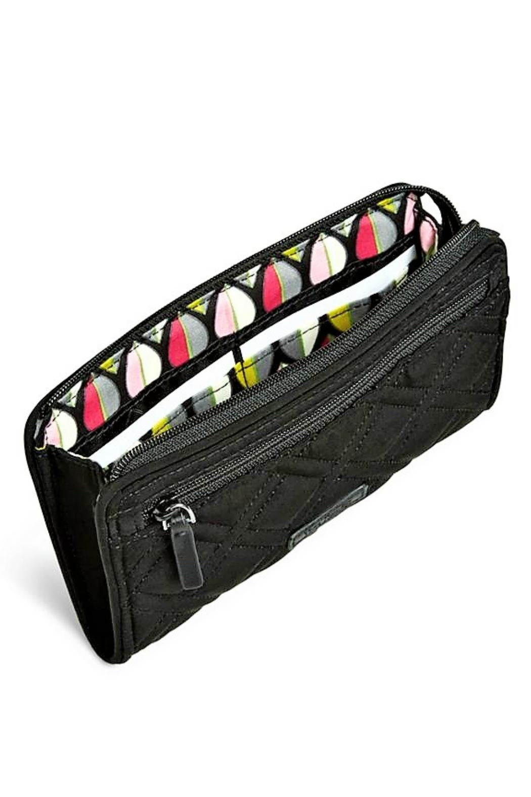 Meet the Vera Bradley RFID Front Zip Wristlet in Classic Black. Ever have one of those days when you aren't sure if you need a wallet or a handbag? The RFID Front Zip Wristlet organizes all of the things you carry in your wallet and also holds a phone! Made from lightweight, basketweave quilted solid-colored microfiber. Provides RFID protection for credit and debit cards. Exterior features one zip pocket. Interior features six card slips and one bill slip. Zip closures. Find other accessories in Classic Black on the "Mimi's Gift Gallery" boutique page! ------- Dimensions 7 ½" w x 4 ½" h x 1" d with 6" vegan leather wrist strap