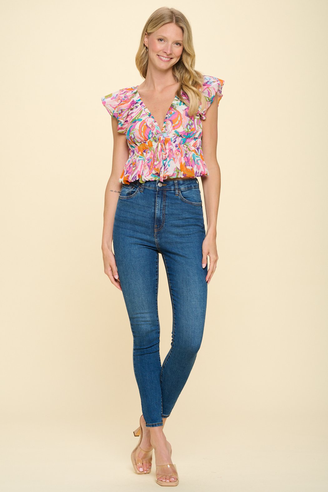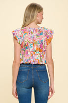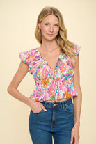 Brighten your wardrobe with this colorful floral print peplum top, designed with a flattering V-neckline and playful ruffled sleeves. The peplum style creates a fitted waist with a flowy bottom, offering a feminine and fun silhouette. Crafted from lightweight, breathable fabric, this top is perfect for pairing with high-waisted jeans or shorts for a casual yet chic look. The vibrant colors and detailed floral print make it ideal for spring and summer outings.