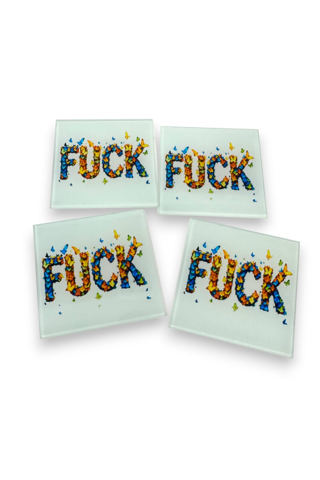 A set of four square glass coasters printed with a colorful butterfly composition that spells out a cheeky word. The Fuck Butterfly Glass Coaster Set protects tabletops from rings and spills while adding playful, irreverent flair to your bar or coffee table. Designed by Kristin Smith, these glass coasters pair durable construction with bold graphic styling for gifting or everyday use.