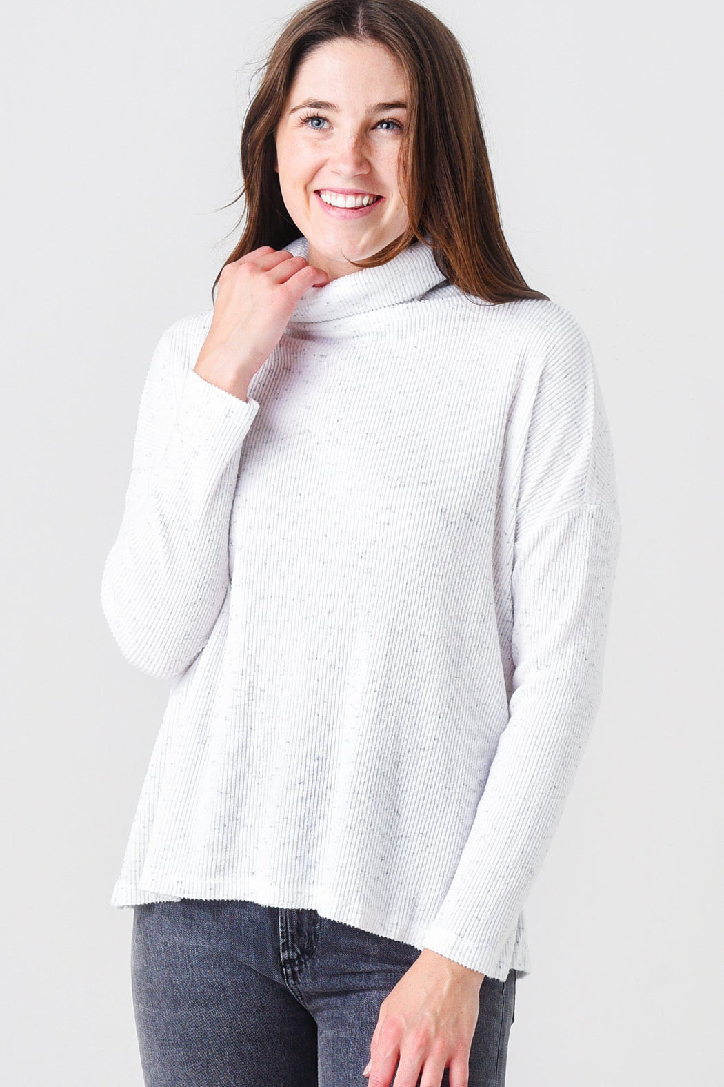 Add a little textured warmth to your wardrobe this season with the Dylan Women's Fuzzy Flecked Fleece Cowl Neck Top.