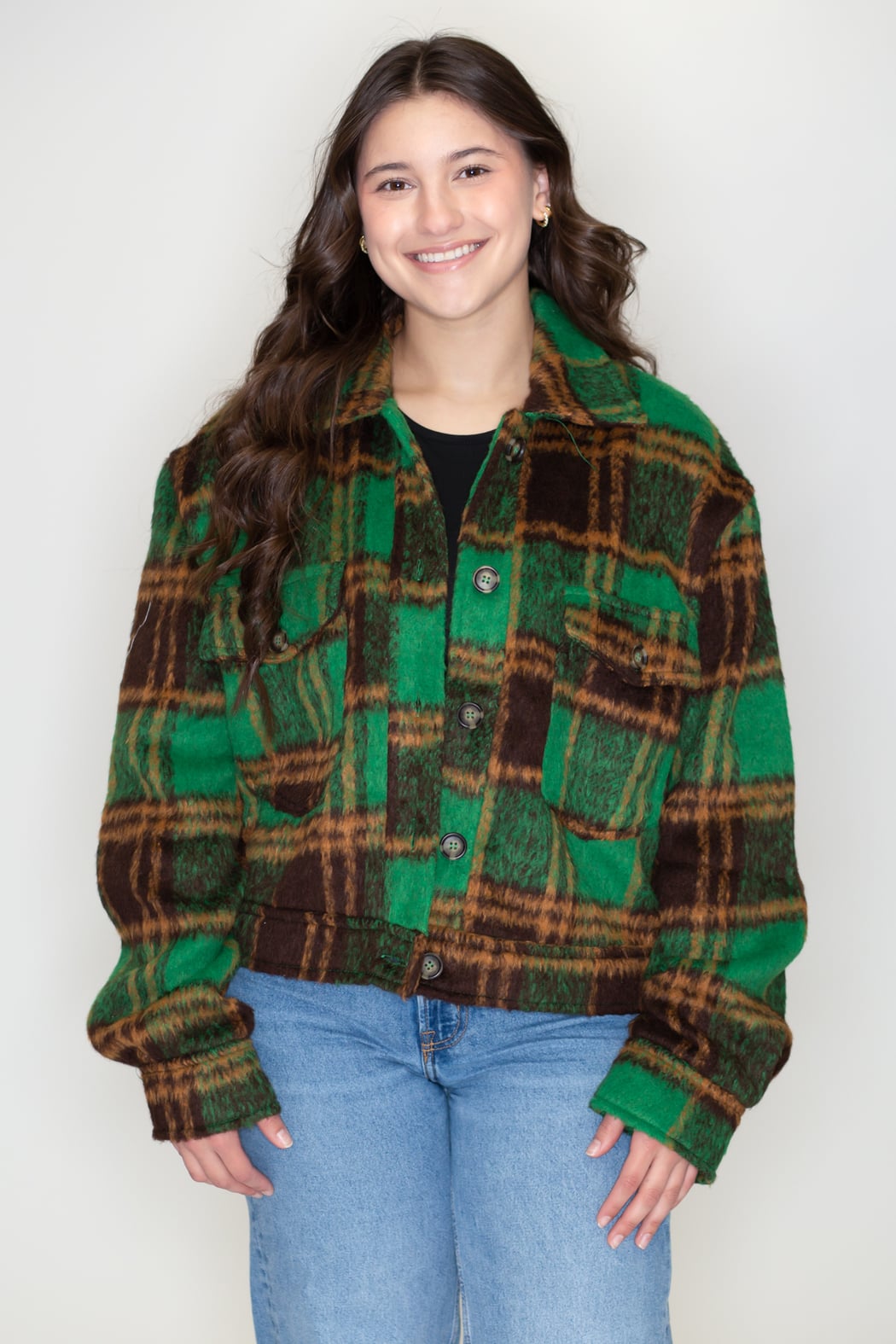 This jacket is constructed from a fuzzy mohair-like fabric that feels dreamy soft against the skin, showcasing a classic plaid print. It's tailored with a collar, drop shoulders, long sleeves and a button-front bodice with flap pockets at chest.
